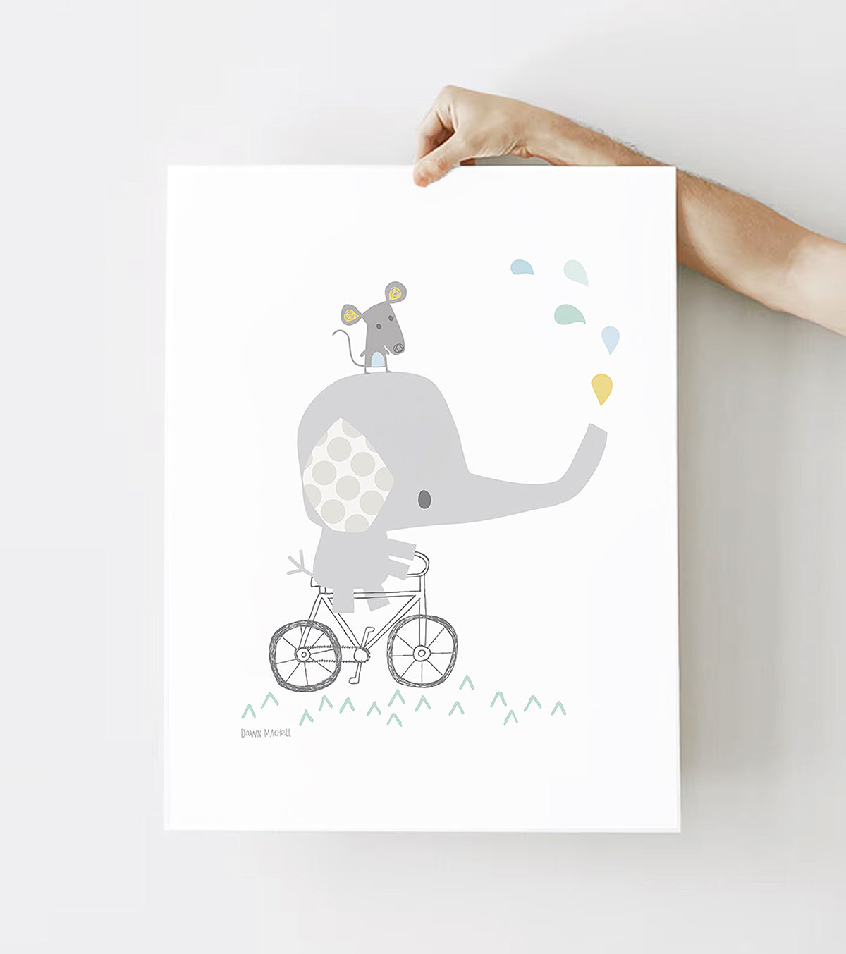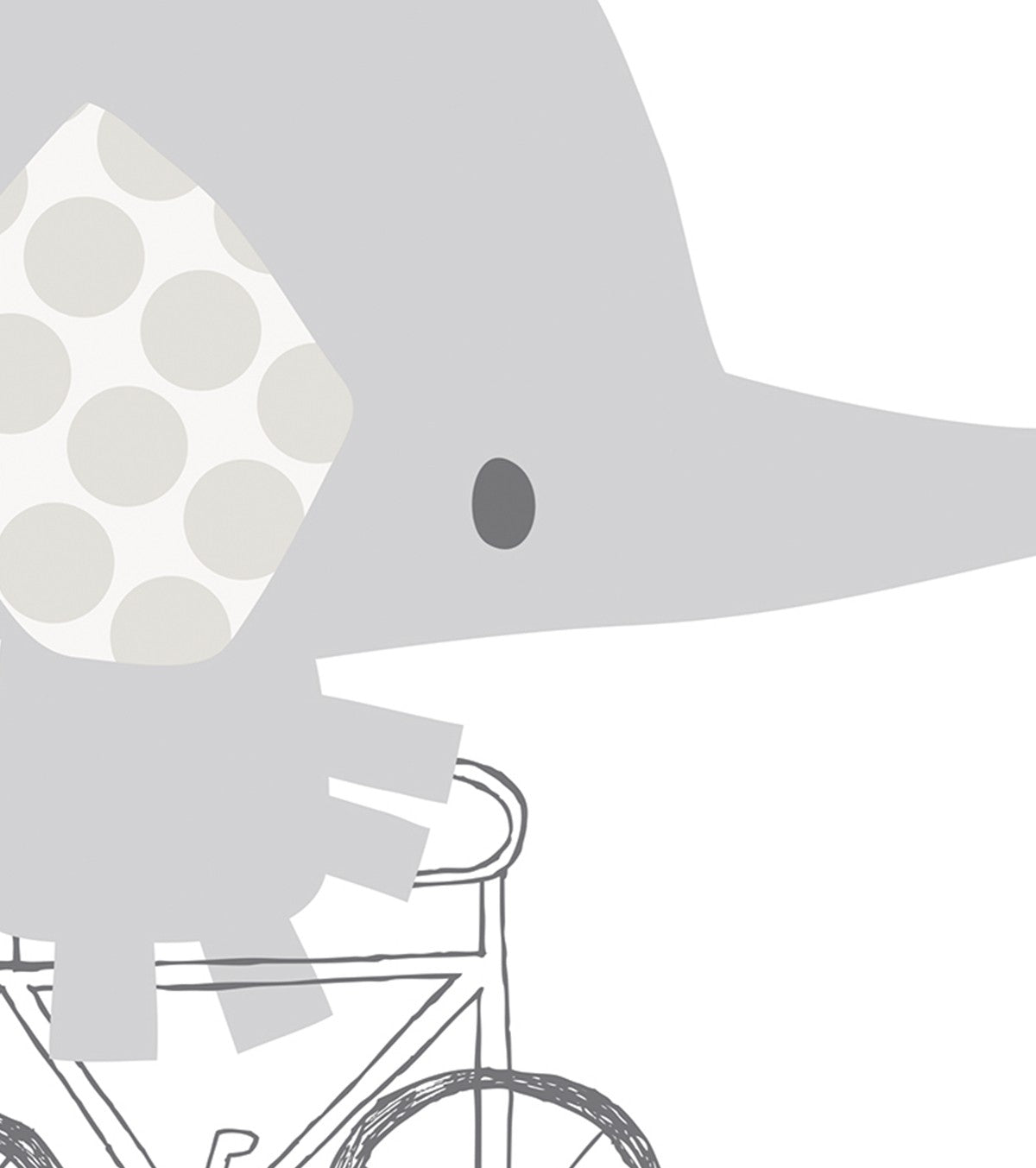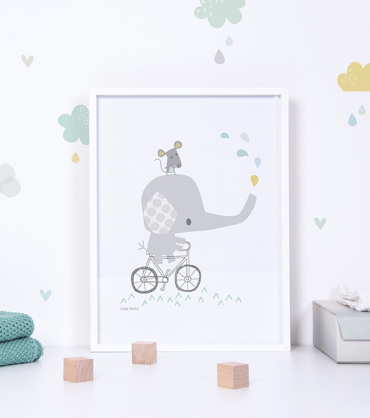 Transformez la chambre de votre enfant en un univers tendre et poétique avec l’affiche Smile, it's raining. Ce superbe visuel met en scène un éléphant joyeux pédalant sous la pluie, apportant une touche de douceur et de rêverie à l’espace.