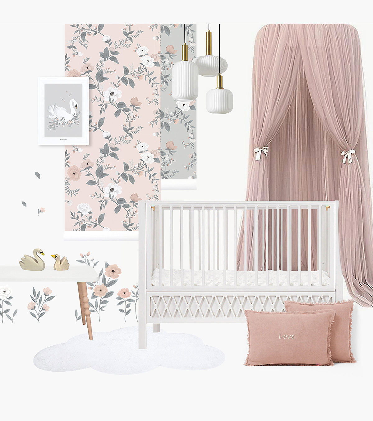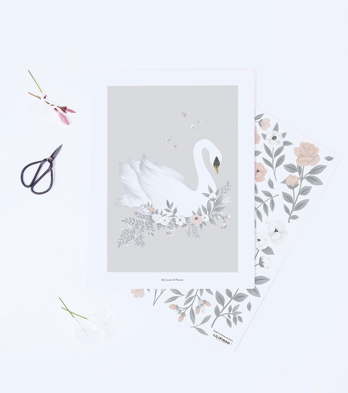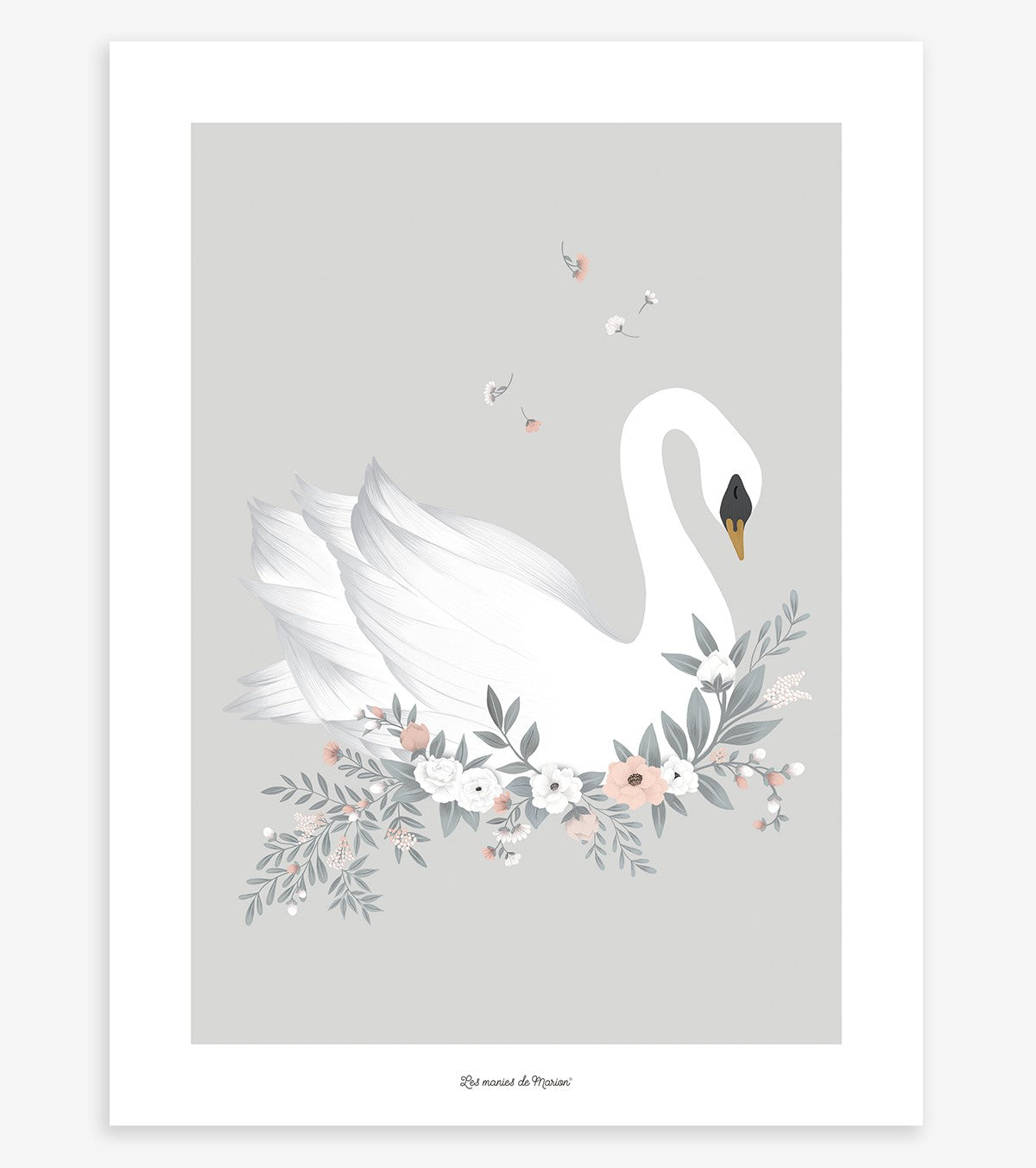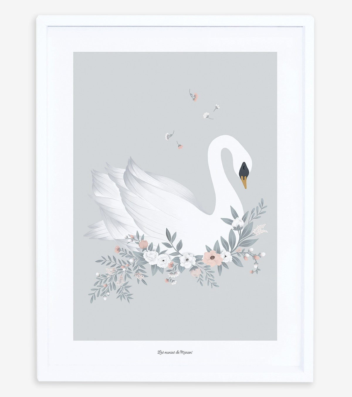 GRACE - Affiche encadrée enfant - Cygne et fleurs (fond gris)
