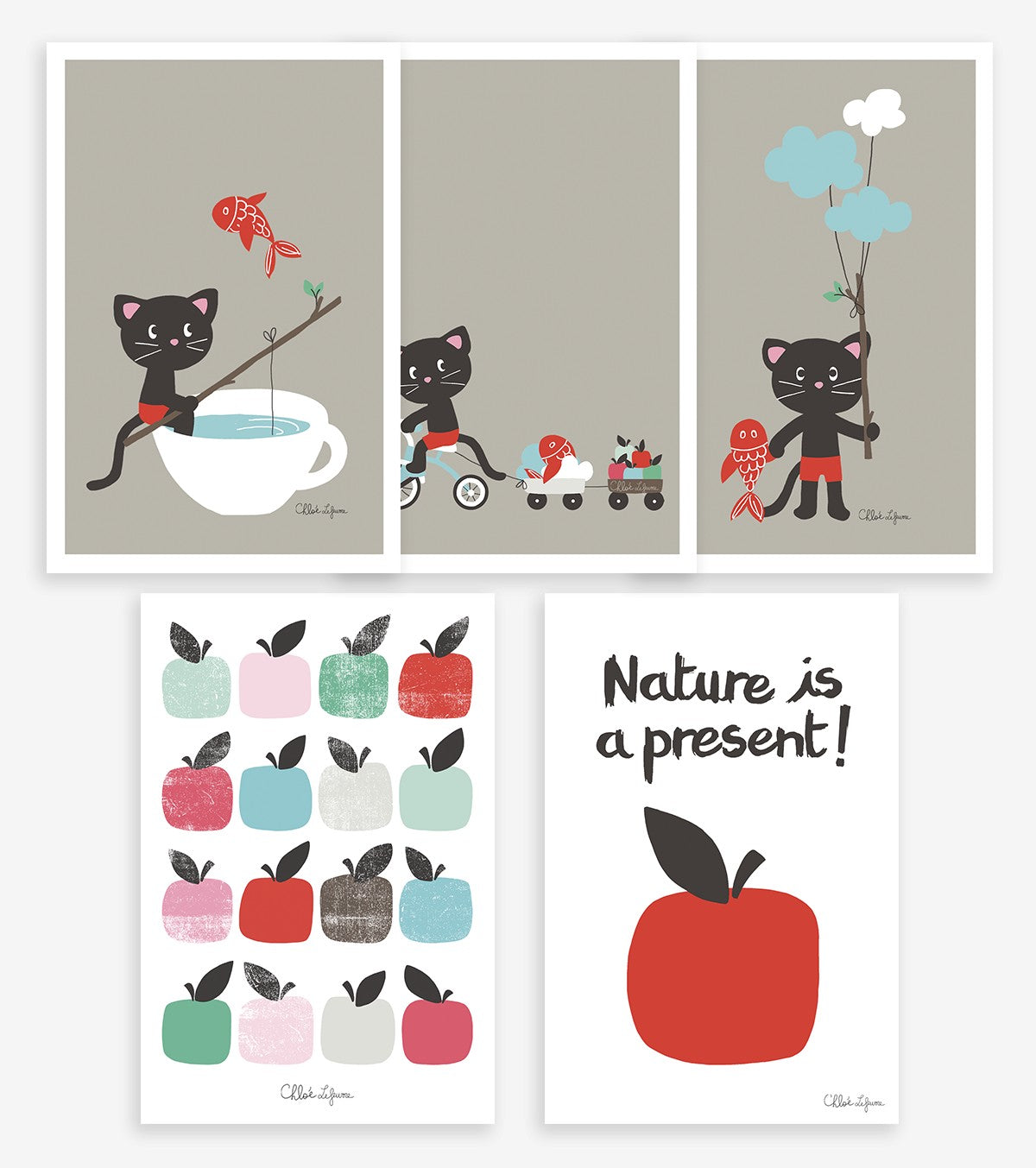 MOKA & POM - Cartes décorative - Chats et poisson (lot 5)