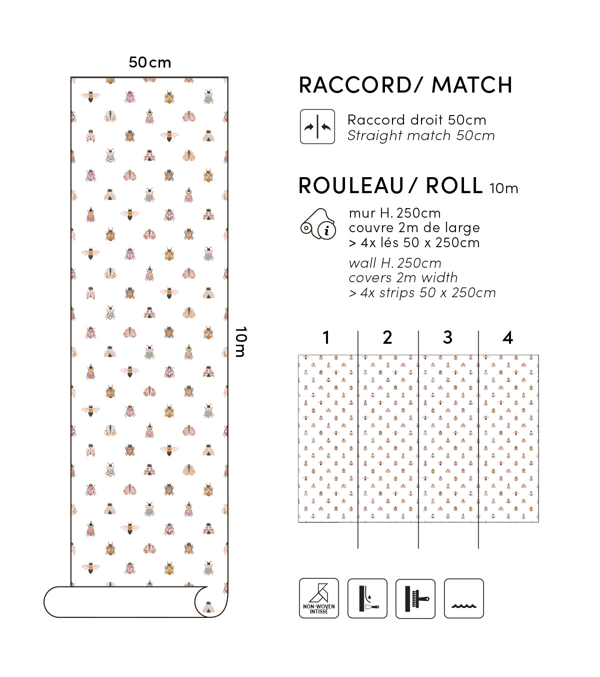 Notre papier peint Coccinella est conçu pour une installation sans tracas grâce à sa composition intissée, qui rend la pose rapide et facile. Il est également lavable à l’éponge, facilitant l'entretien et garantissant que les murs de la chambre restent frais et propres.