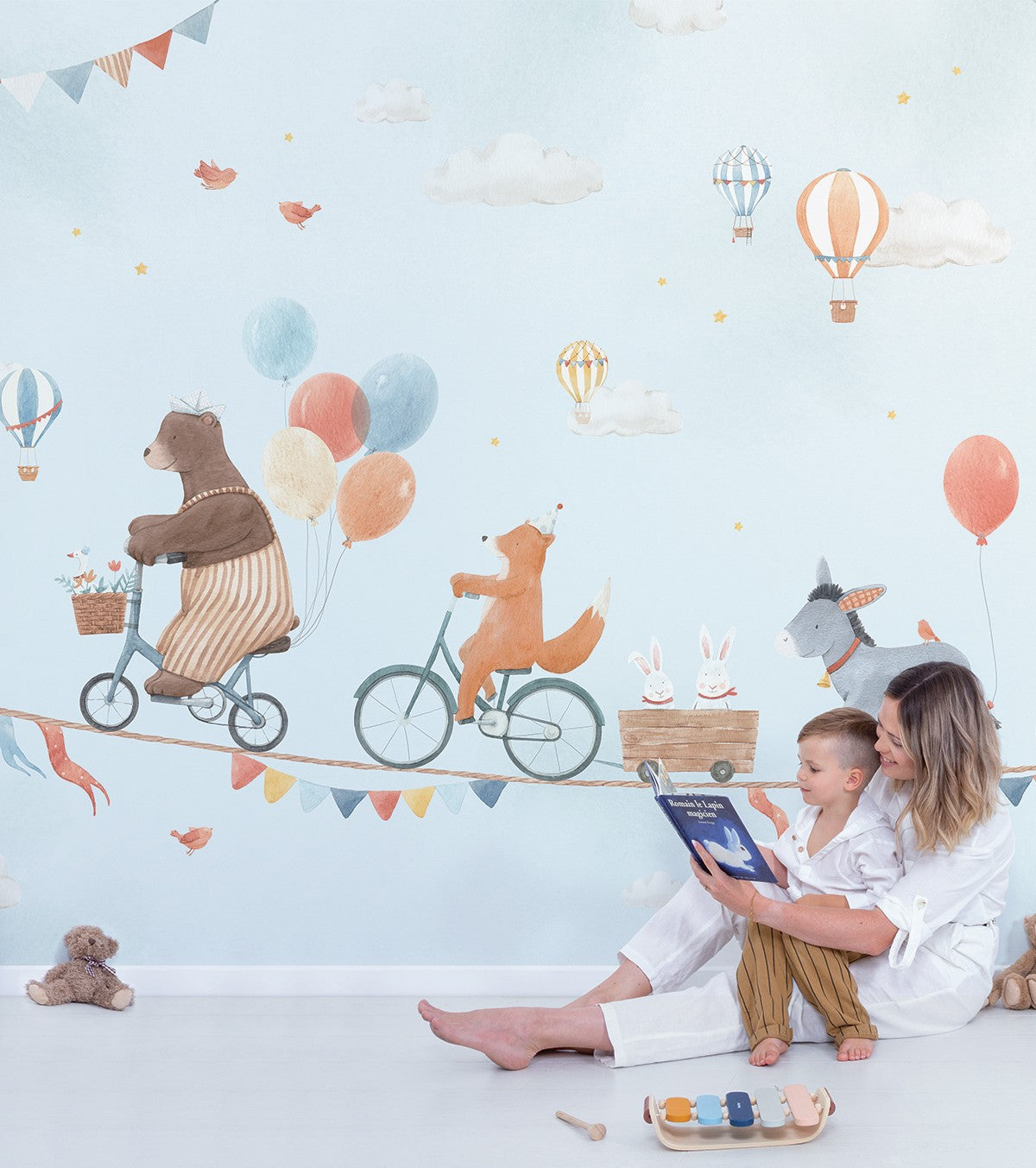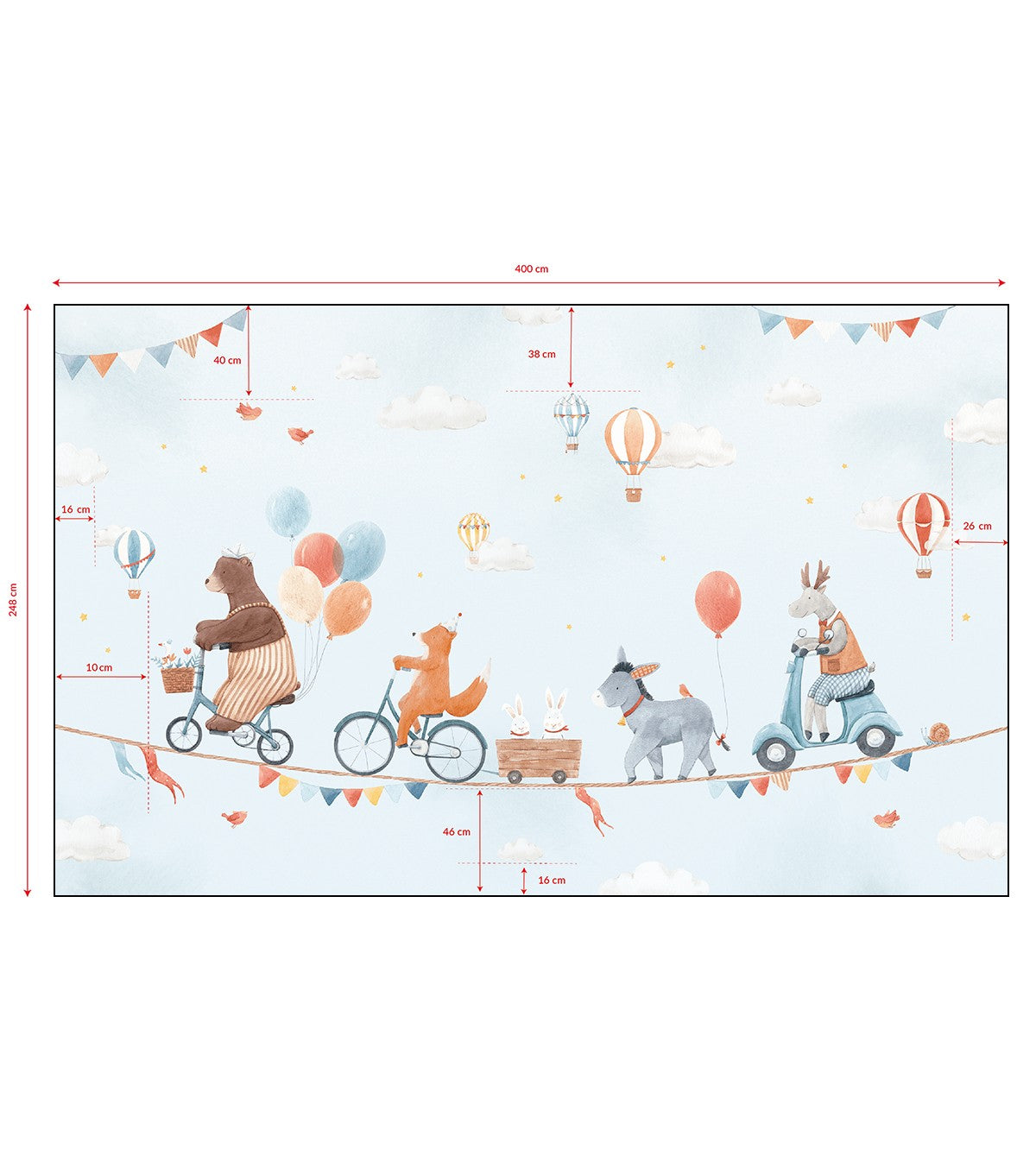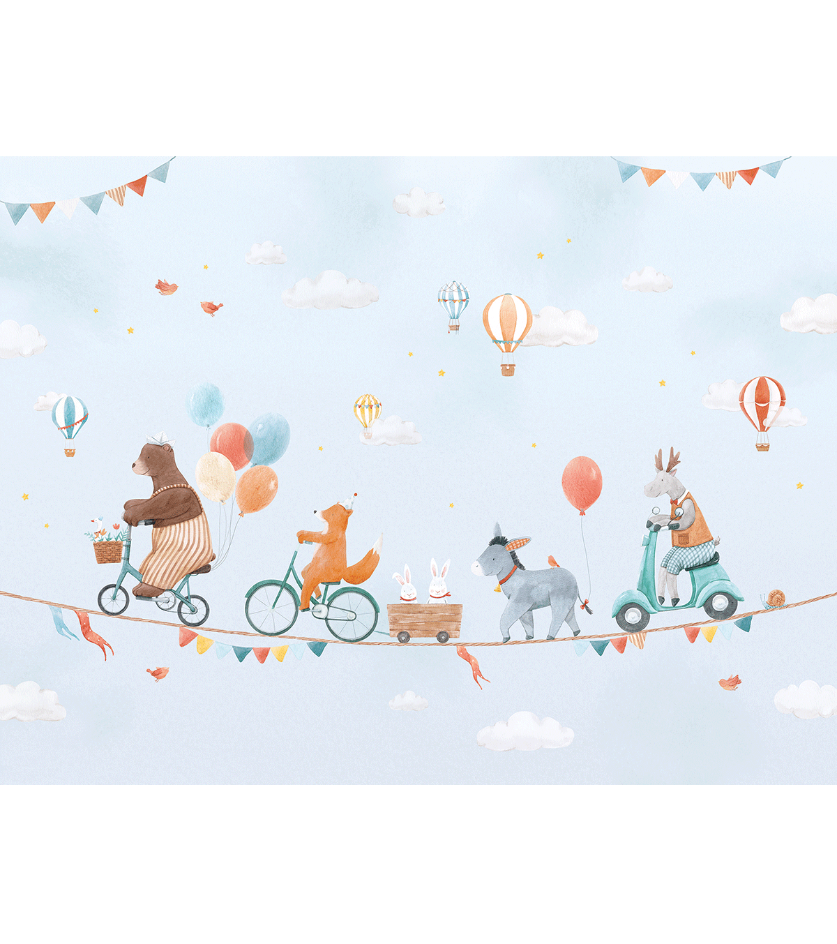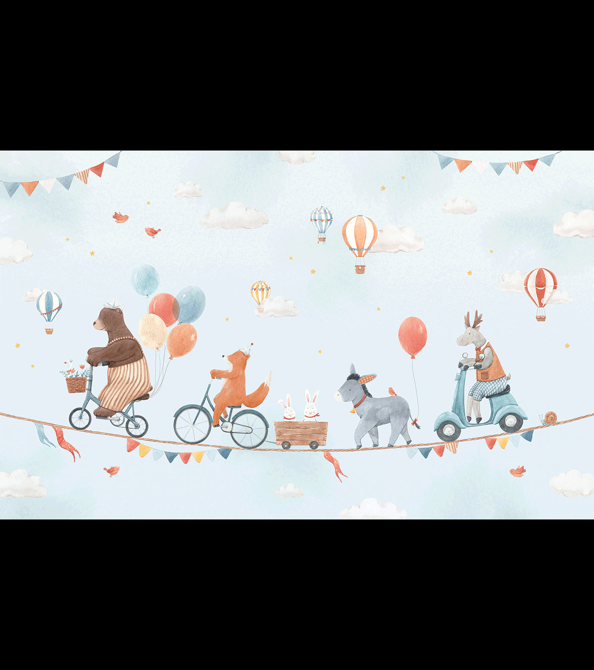 Ce décor mural enchanteur met en scène des animaux adorables jouant avec des ballons et des montgolfières, idéal pour éveiller la curiosité et l'émerveillement des enfants. Sa palette de teintes pastel, comprenant des nuances de bleu et d'orange, crée une ambiance douce et réconfortante, parfaite pour un espace de sommeil et de jeu.