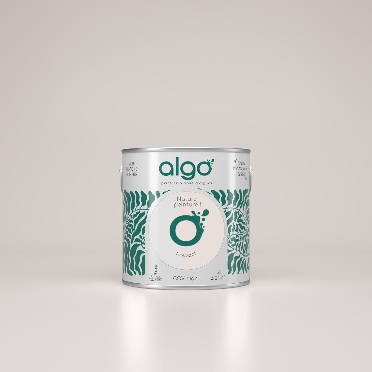 Les matières premières utilisées pour la peinture Algo sont naturelles et proviennent de sources durables. Il s'agit d'une peinture écologique à base d'algues, fabriquée 100 % française en Bretagne.