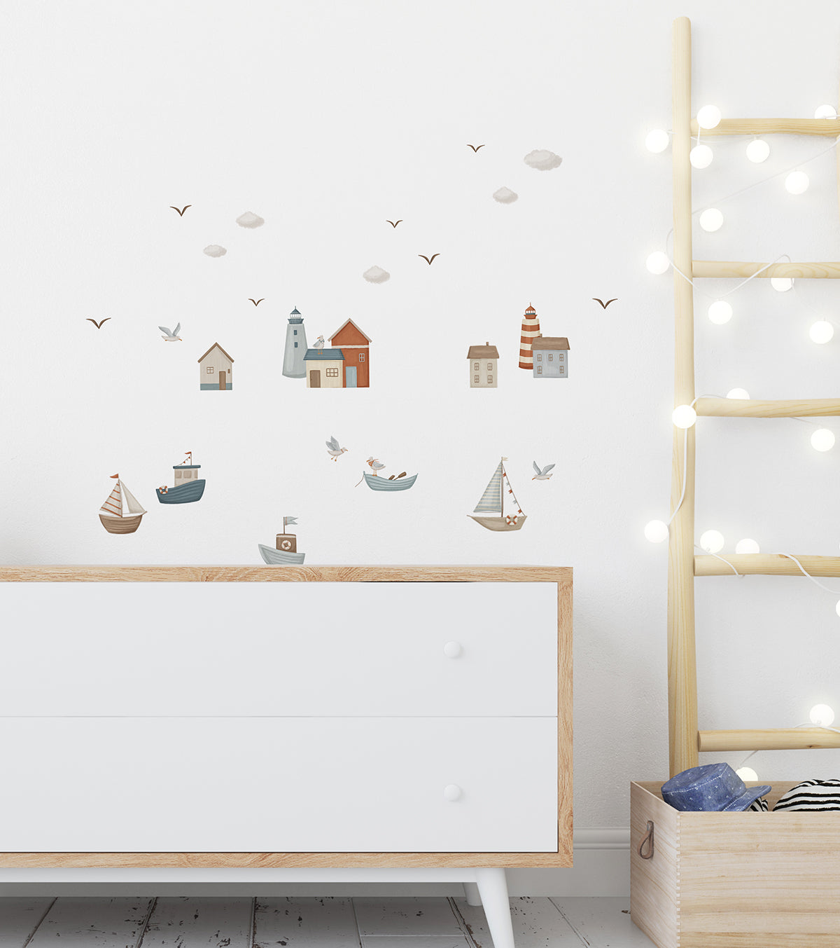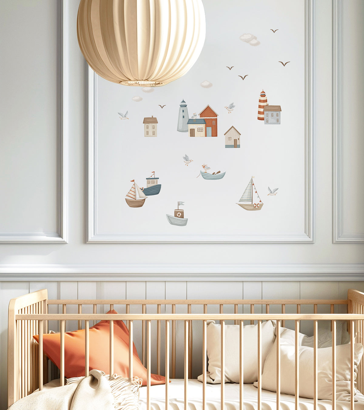 Les stickers muraux "Village Marin" maisons, bateaux, mouettes et nuages, ces stickers créent une ambiance marine apaisante.