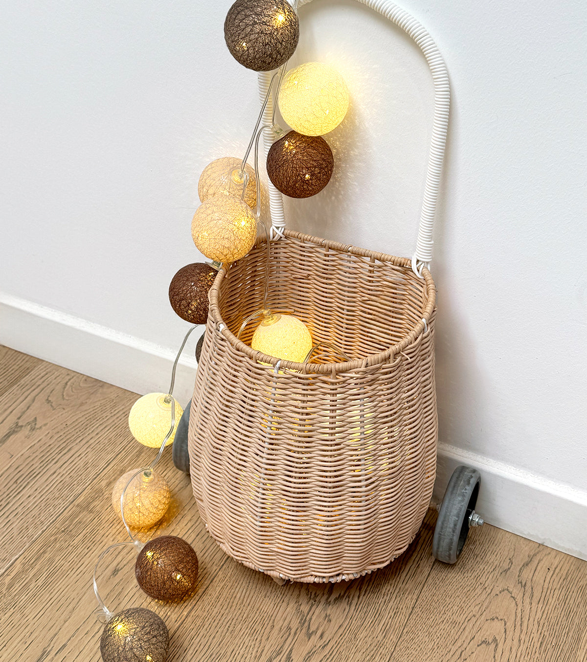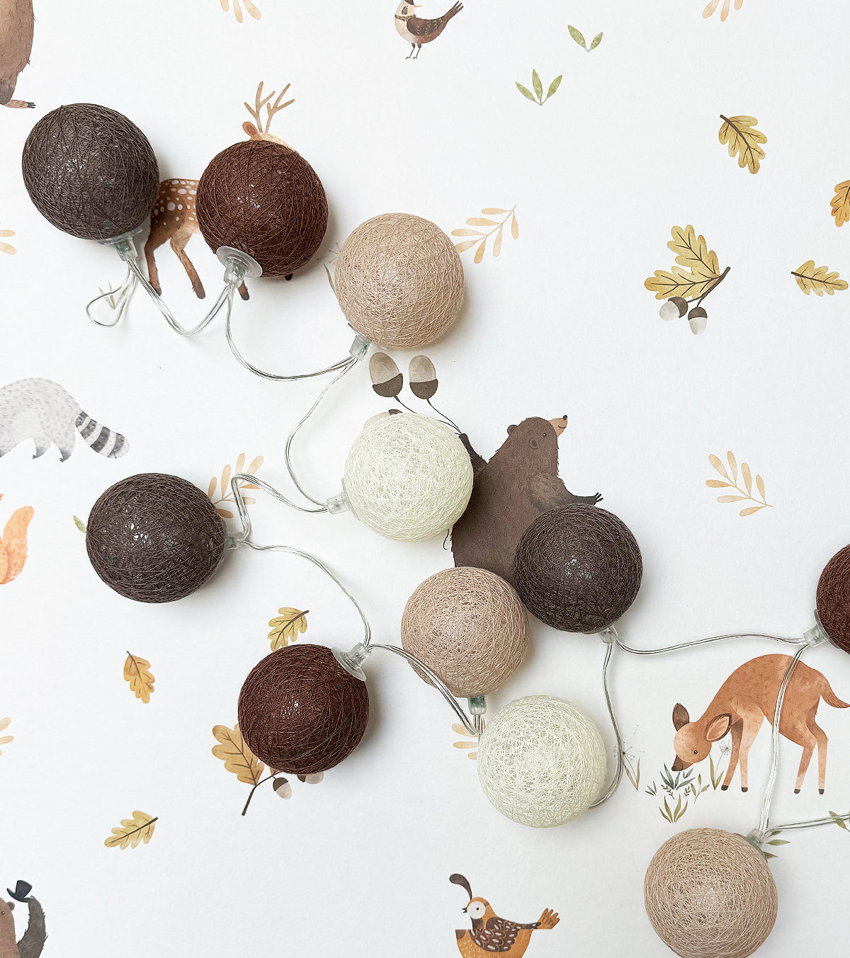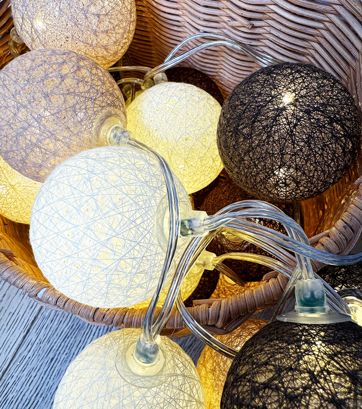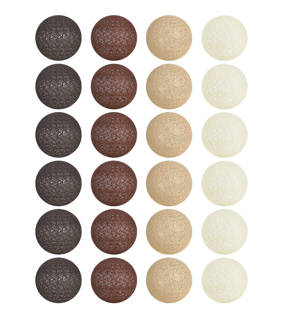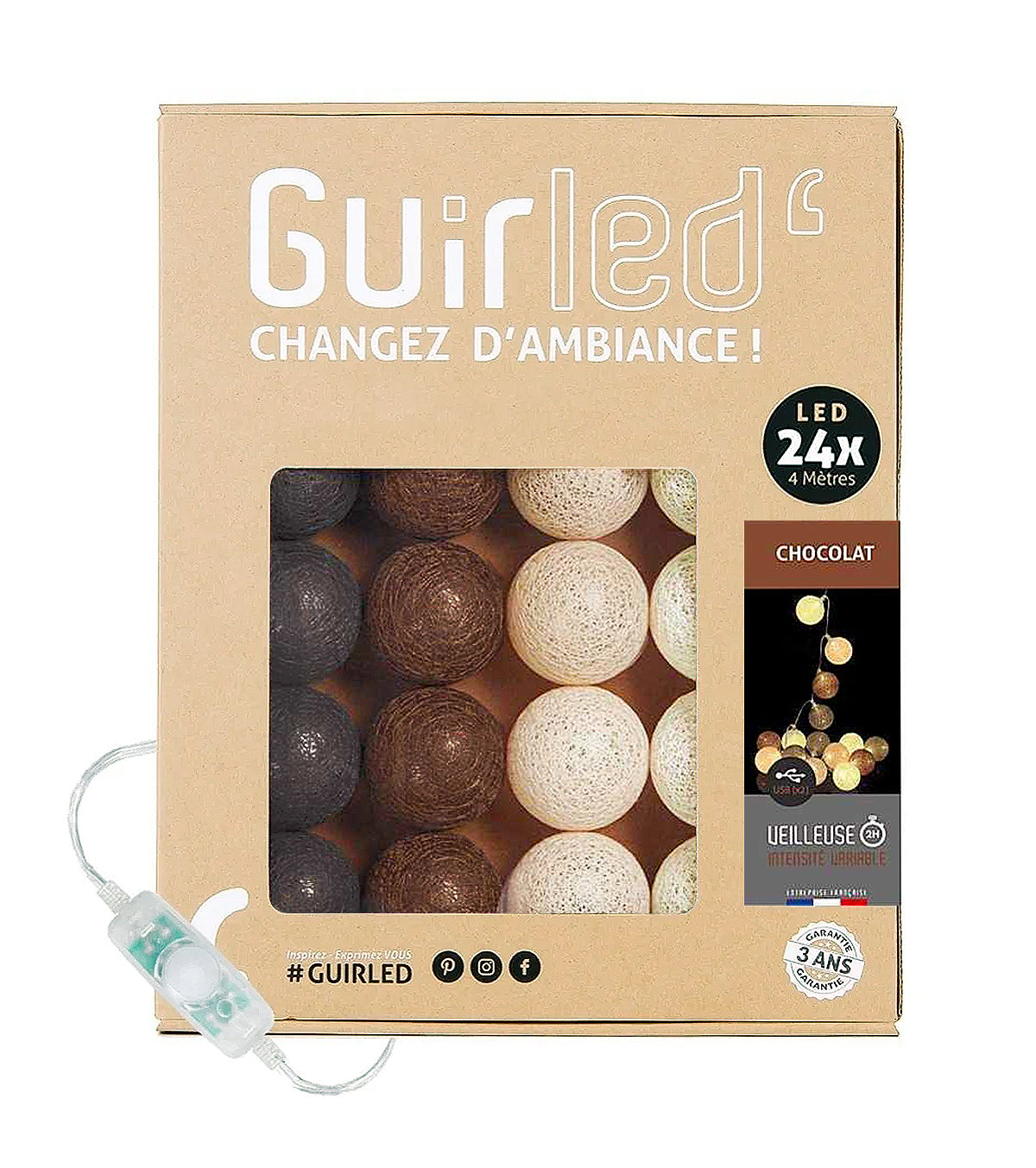 Guirlande lumineuse led 24 boules composé de 4 couleurs : taupe, marron châtaigne, beige, blanc cassé. Longueur totale 24 boules : 4 mètres, dont 2,4 mètres de boules.