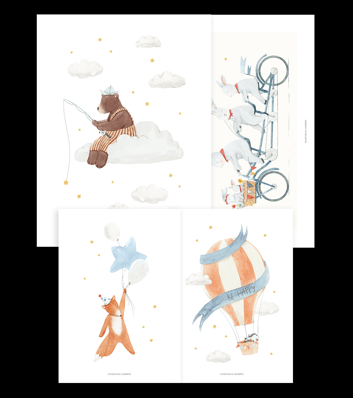 GENTLE FRIENDS - Lot de 4 affiches enfant - Lapin, ours, renard, montgolfières