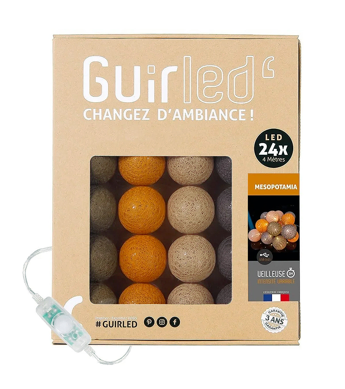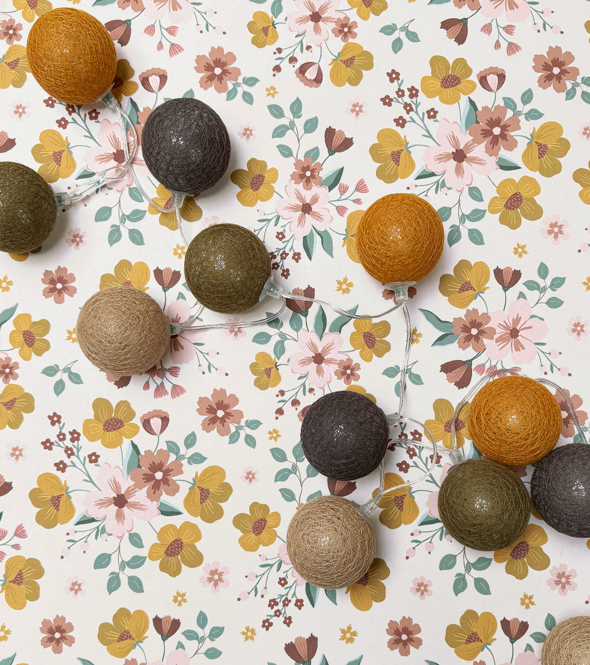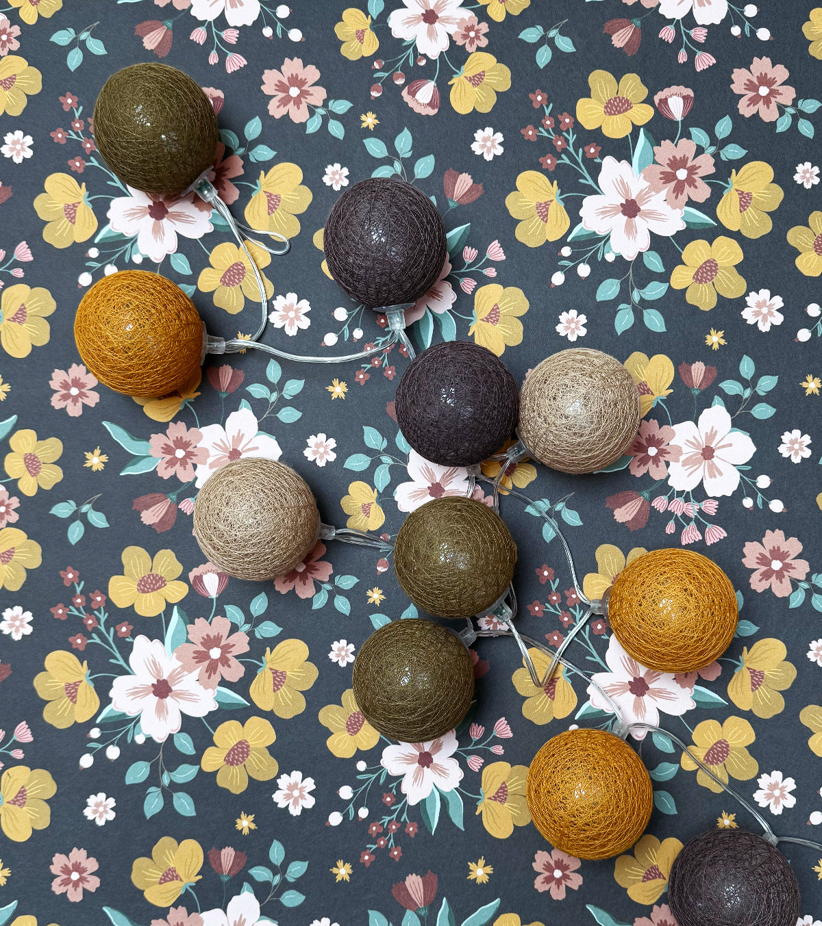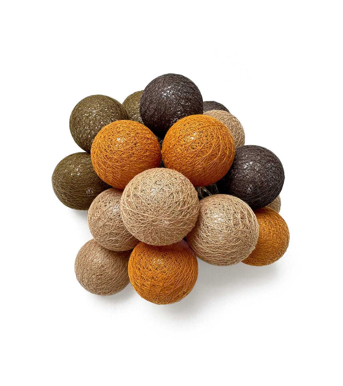 Guirlande lumineuse led 24 boules composé de 4 couleurs : kaki, moutarde, caramel, taupe. Longueur totale 24 boules : 4 mètres, dont 2,4 mètres de boules.