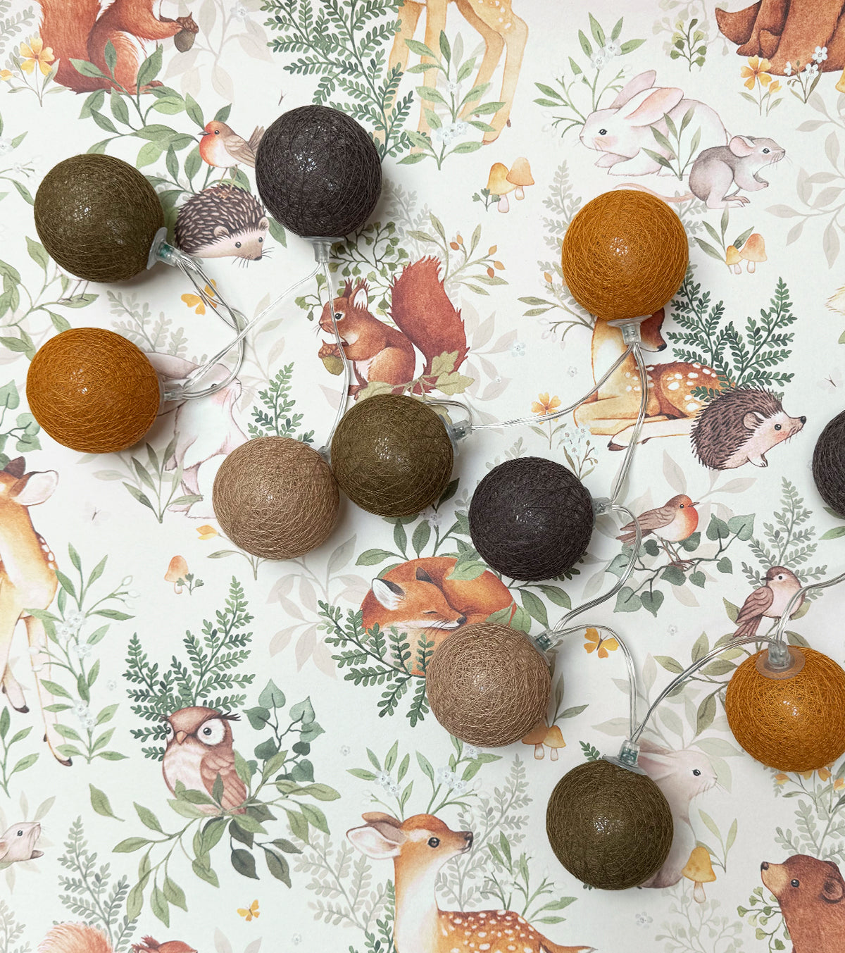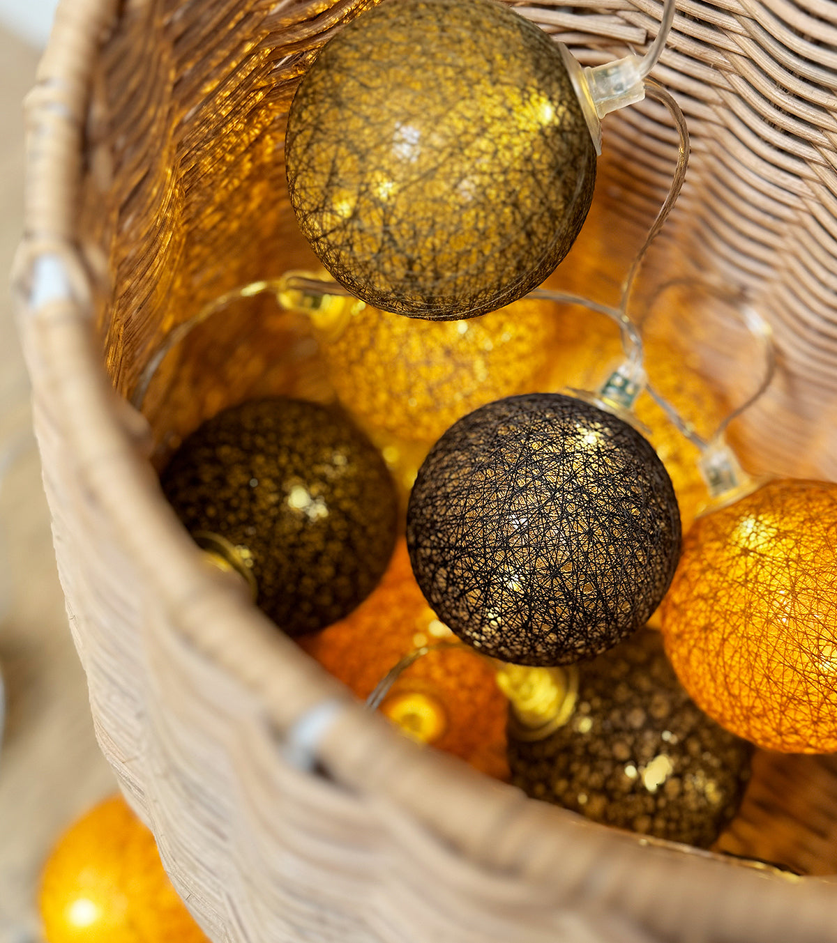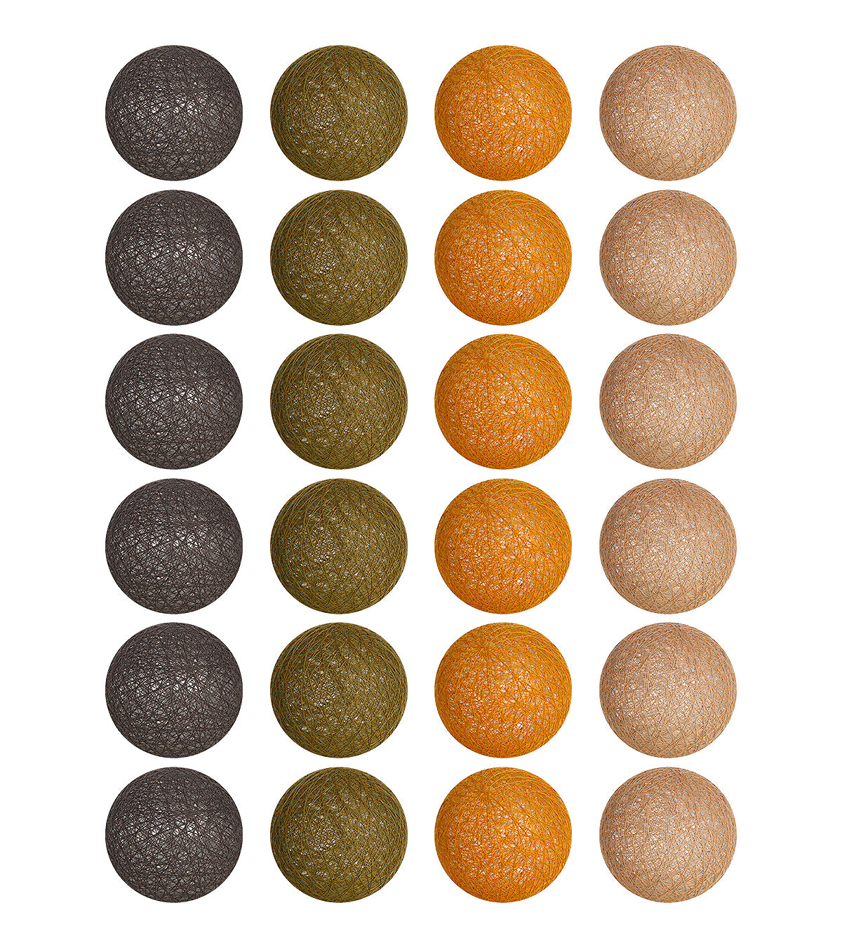 Guirlande lumineuse led 24 boules composé de 4 couleurs : kaki, moutarde, caramel, taupe. Longueur totale 24 boules : 4 mètres, dont 2,4 mètres de boules.