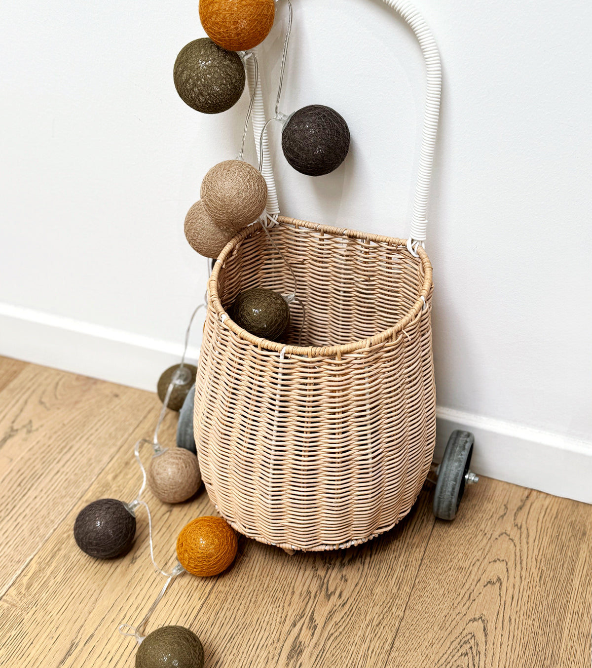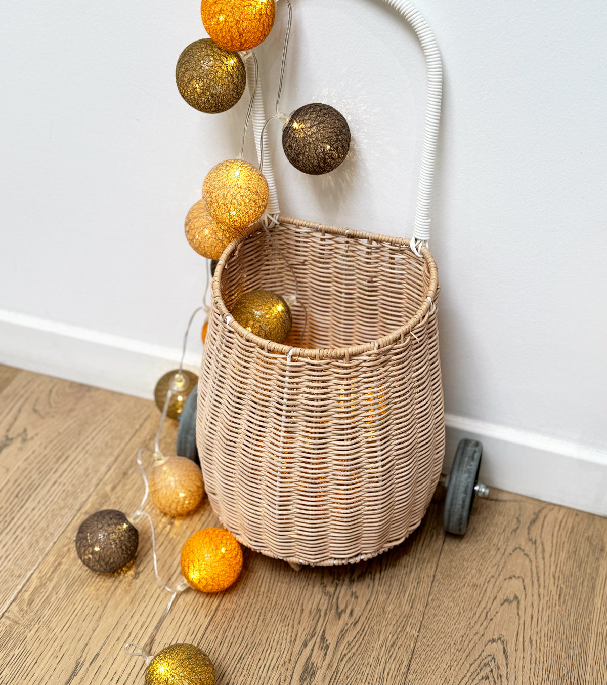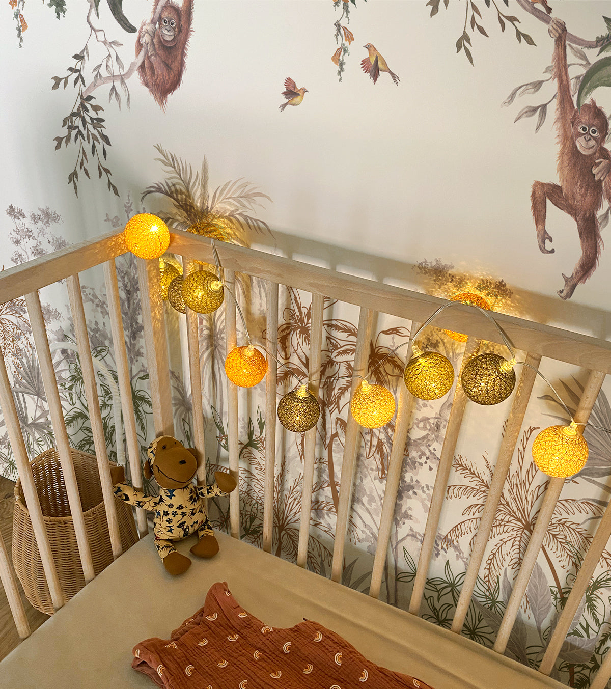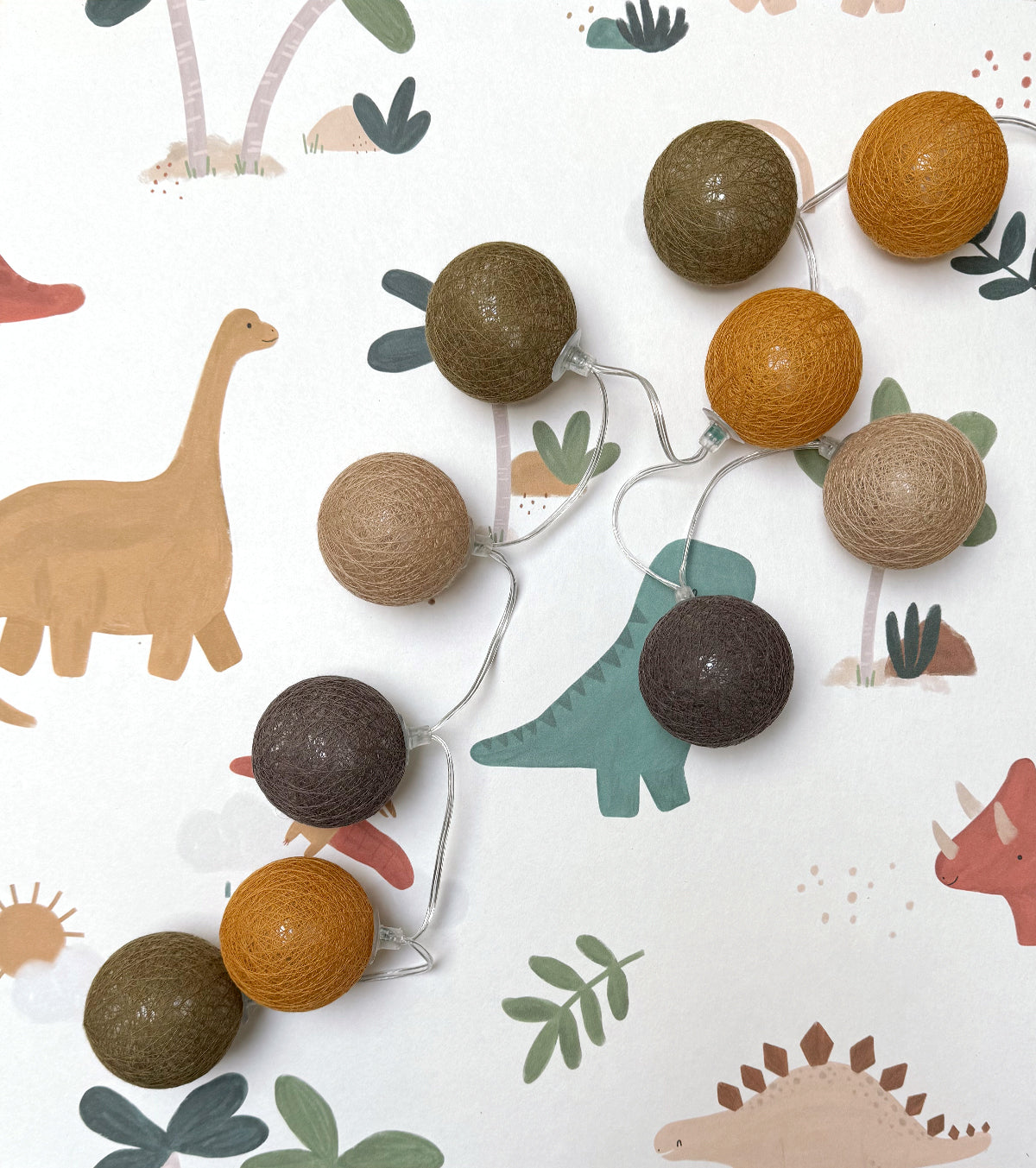 Guirlande lumineuse led 24 boules composé de 4 couleurs : kaki, moutarde, caramel, taupe. Longueur totale 24 boules : 4 mètres, dont 2,4 mètres de boules.