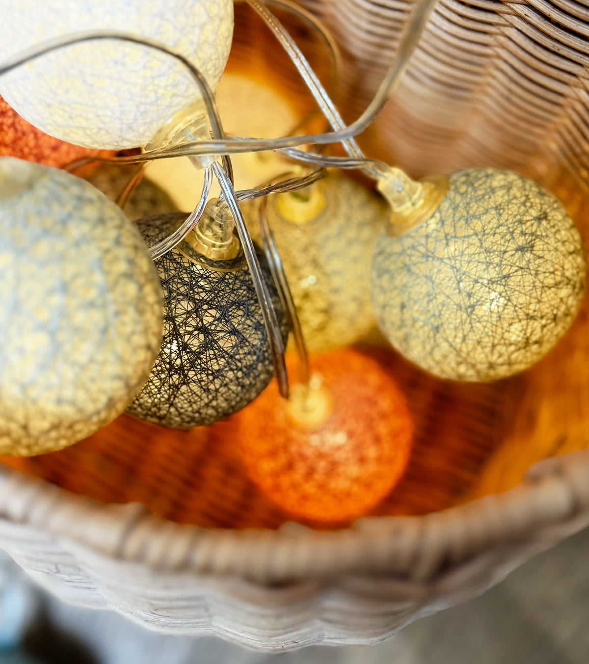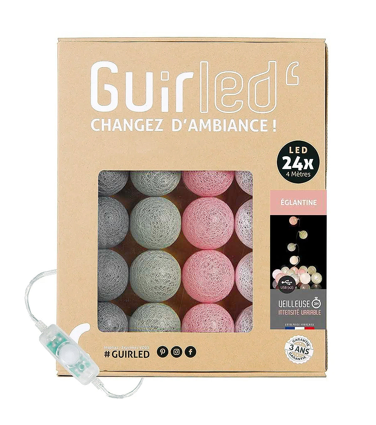 Guirlande lumineuse led 24 boules composé de 4 couleurs : gris, souris, vieux rose, blanc. Longueur totale 24 boules : 4 mètres, dont 2,4 mètres de boules.