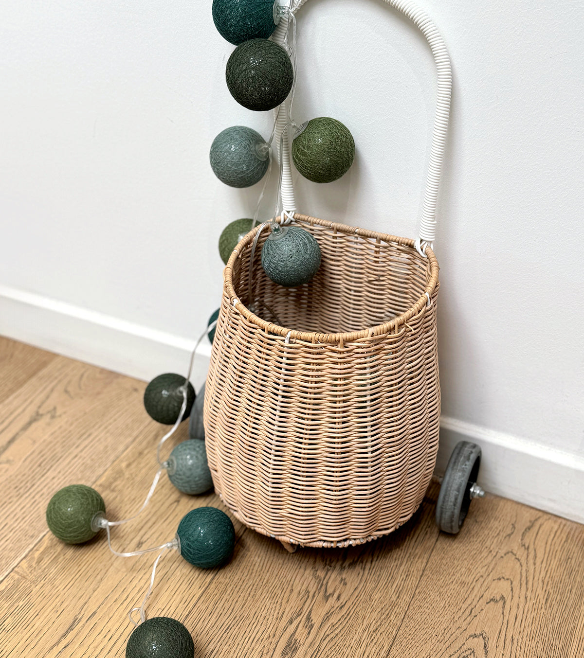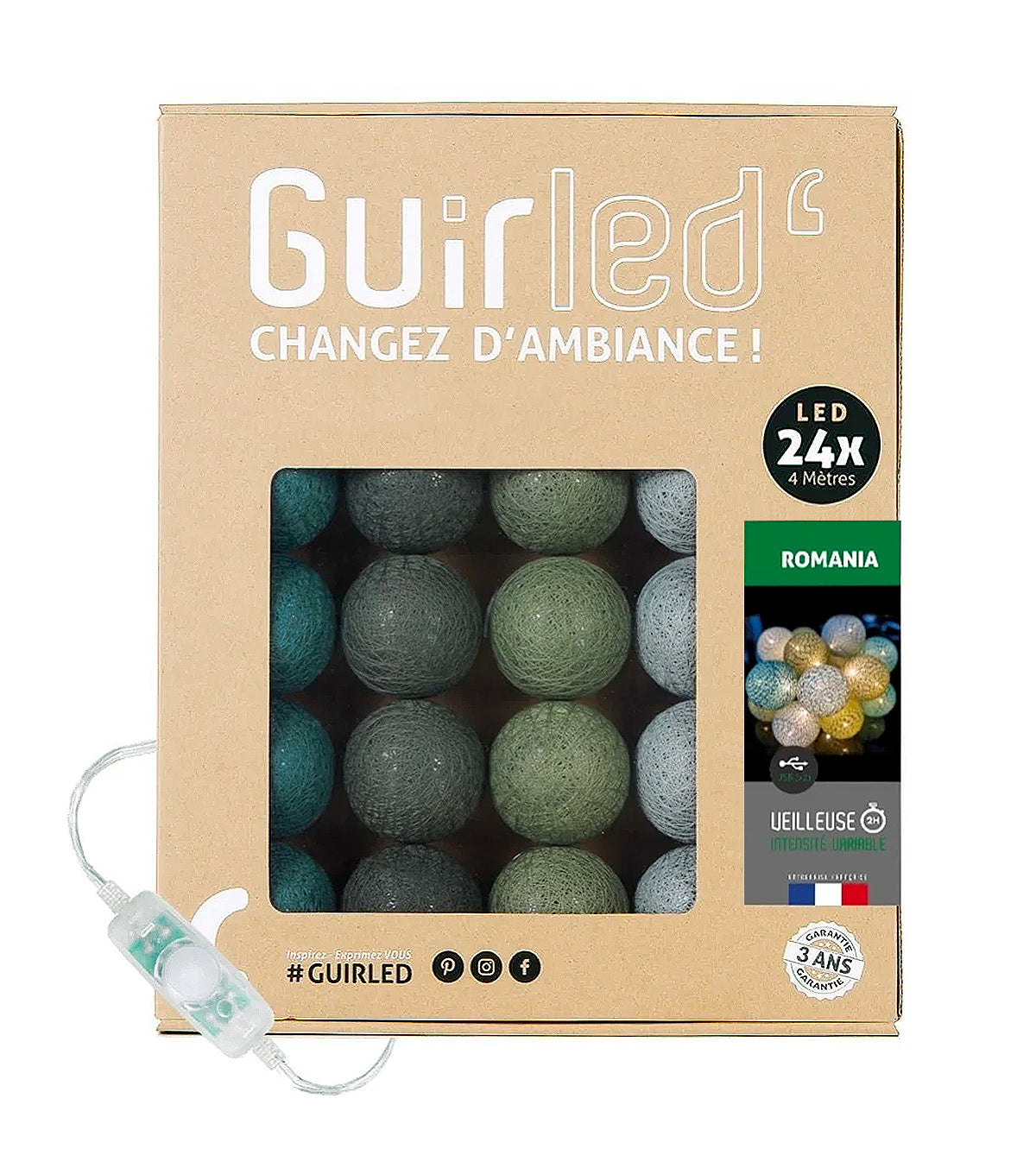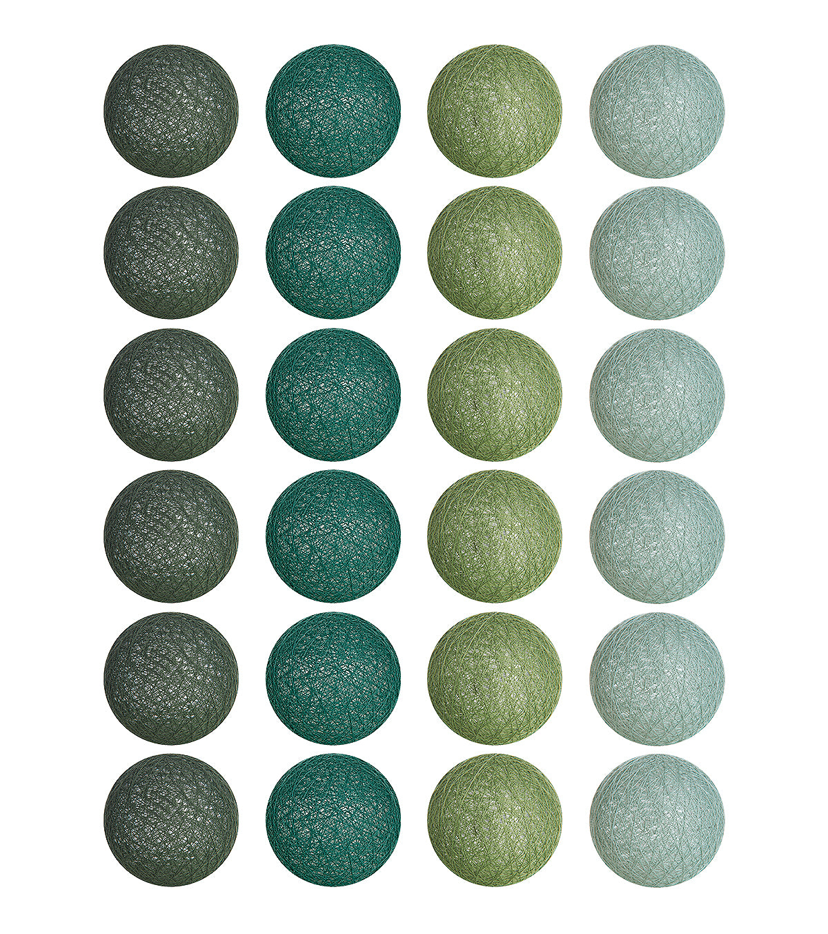 Guirlande lumineuse led 24 boules composé de 4 couleurs : agave, vert algue, vert cactus, bleu céladon. Longueur totale 24 boules : 4 mètres, dont 2,4 mètres de boules.