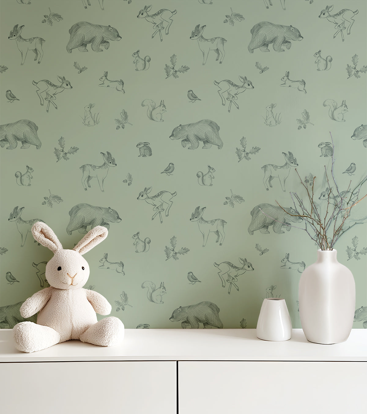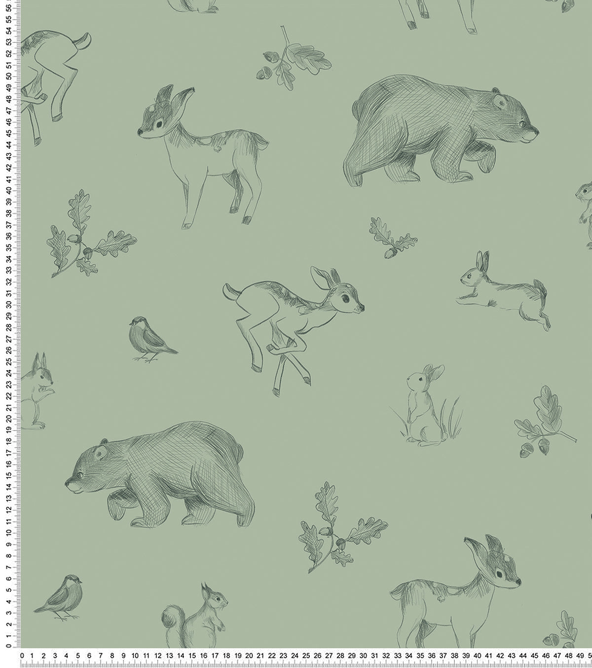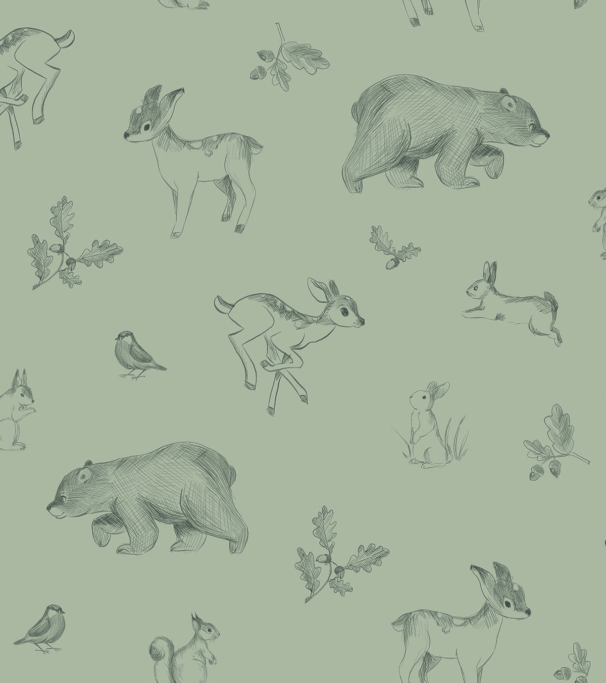 Avec le papier peint Forest Friends, offrez à la chambre de votre enfant une ambiance douce et sereine inspirée de la forêt. Ce motif délicat mettant en scène des animaux de la forêt — ours, écureuils, faons — existe en trois coloris : fond blanc/beige, fond sauge (vert doux) et fond dark green (vert profond).