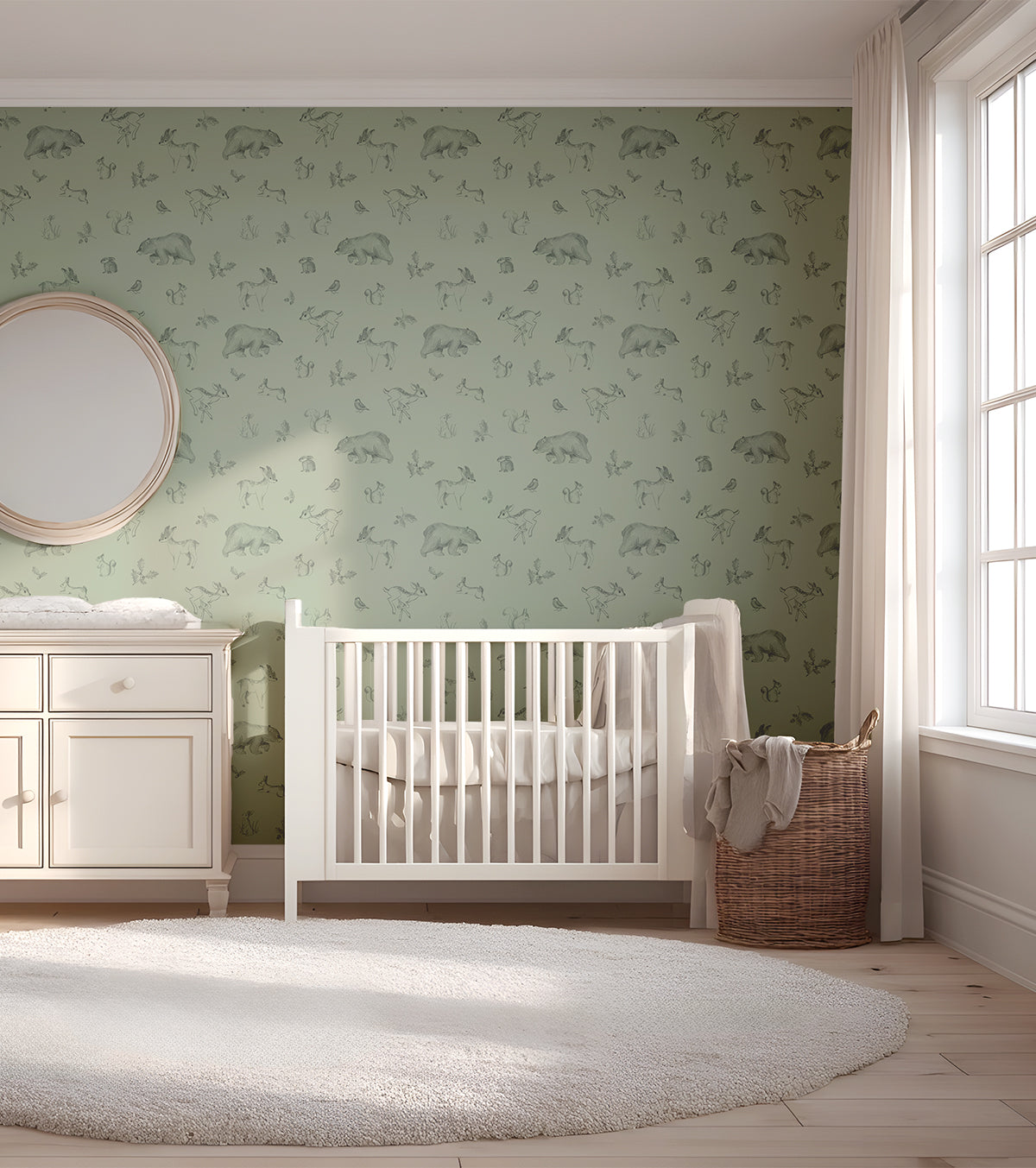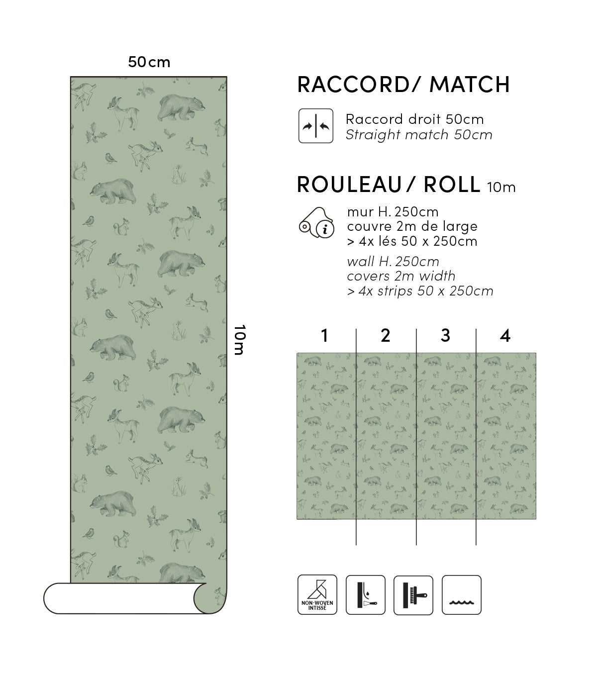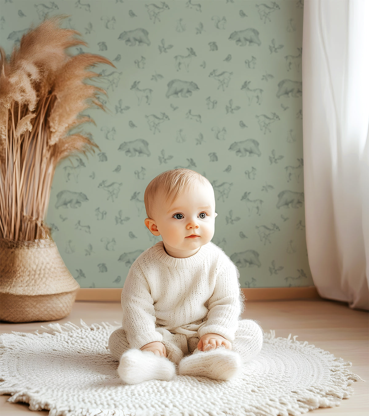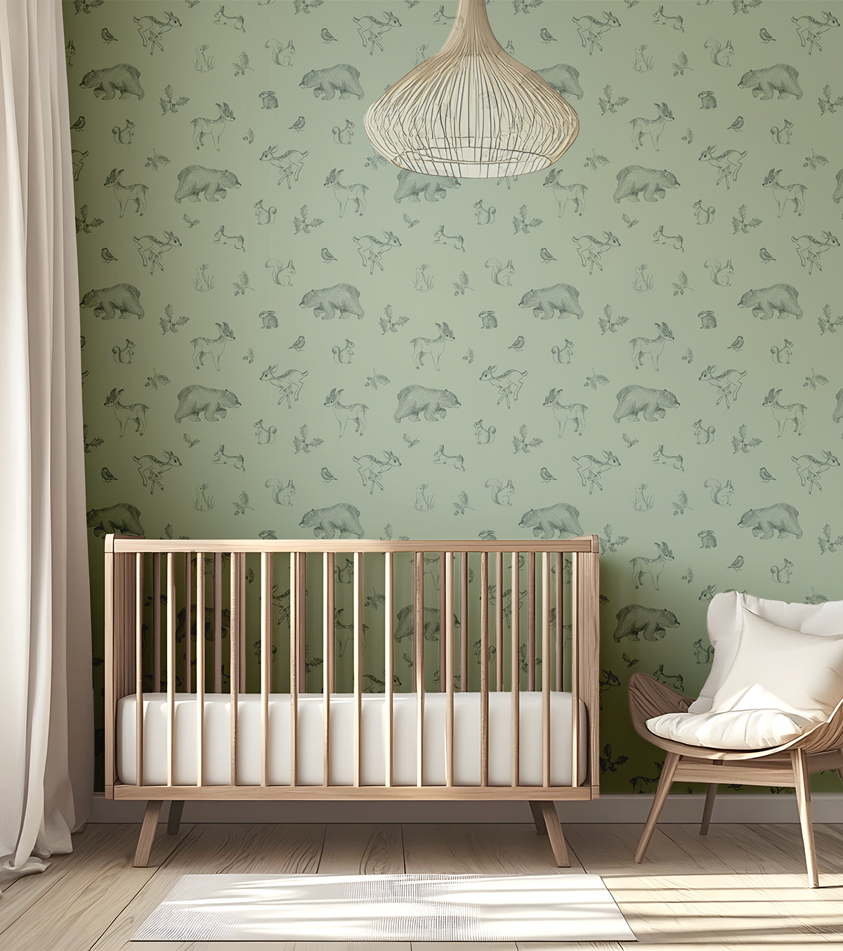 Avec le papier peint Forest Friends, offrez à la chambre de votre enfant une ambiance douce et sereine inspirée de la forêt. Ce motif délicat mettant en scène des animaux de la forêt — ours, écureuils, faons — existe en trois coloris : fond blanc/beige, fond sauge (vert doux) et fond dark green (vert profond).