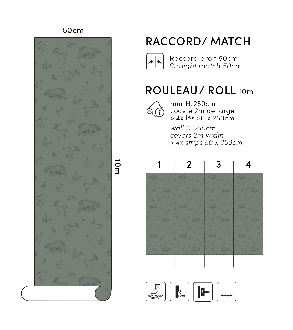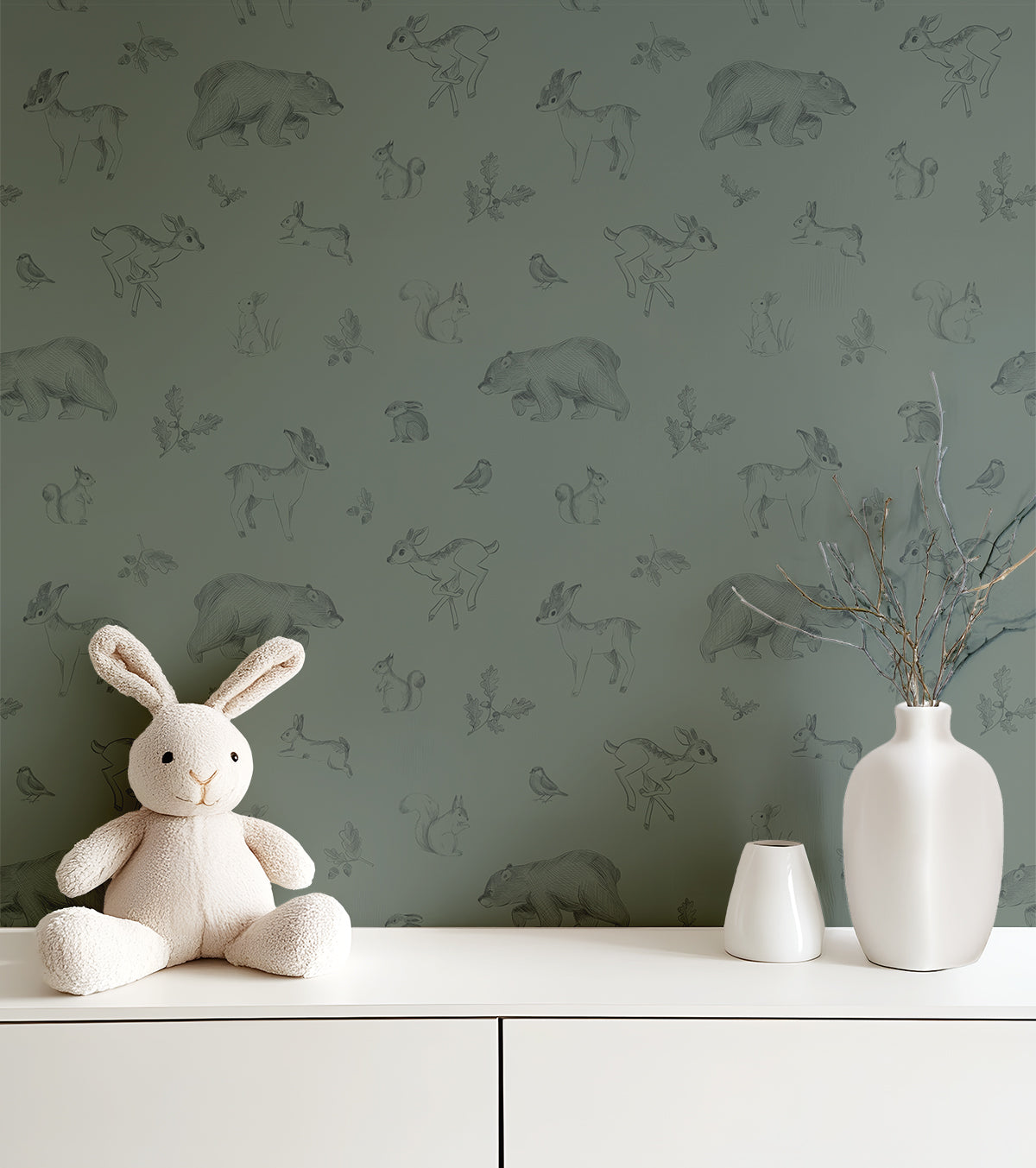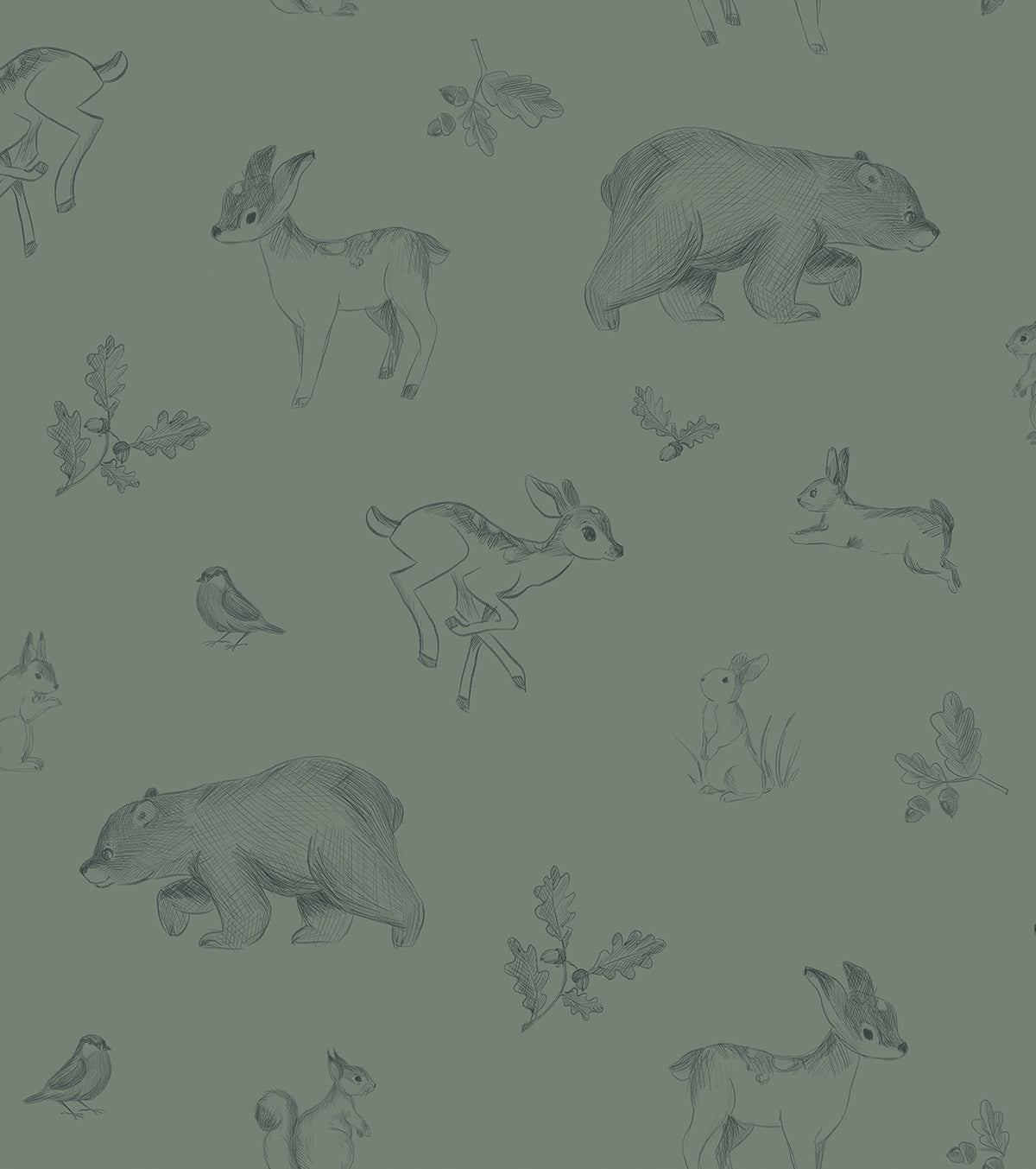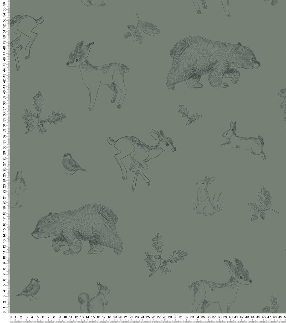 Transformez la chambre de votre enfant en une véritable clairière enchantée grâce au papier peint animaux forêt vert Forest Friends Dark Green. Avec ses adorables motifs d’animaux de la forêt – faons curieux, ours, écureuils malicieux et oiseaux discrets – ce décor mural crée une ambiance poétique, naturelle et résolument apaisante.