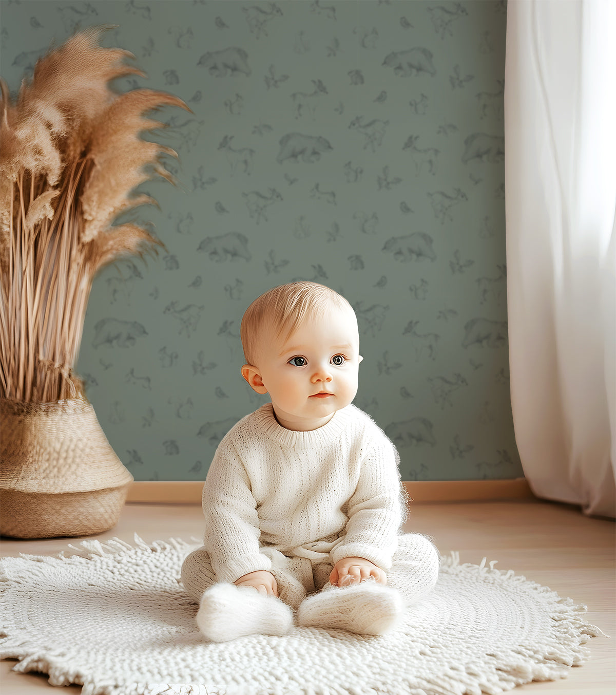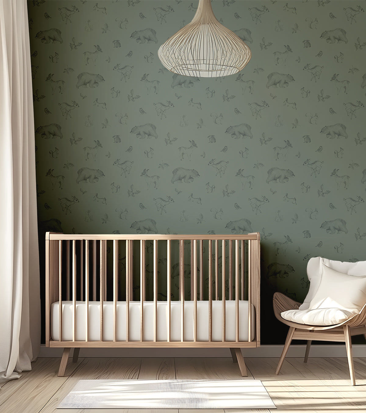 Idéal pour instaurer une atmosphère douce et rassurante, ce papier peint s’inscrit dans une tendance déco inspirée de la nature nordique, parfaite pour les chambres d’enfant, les espaces de jeux ou les crèches.