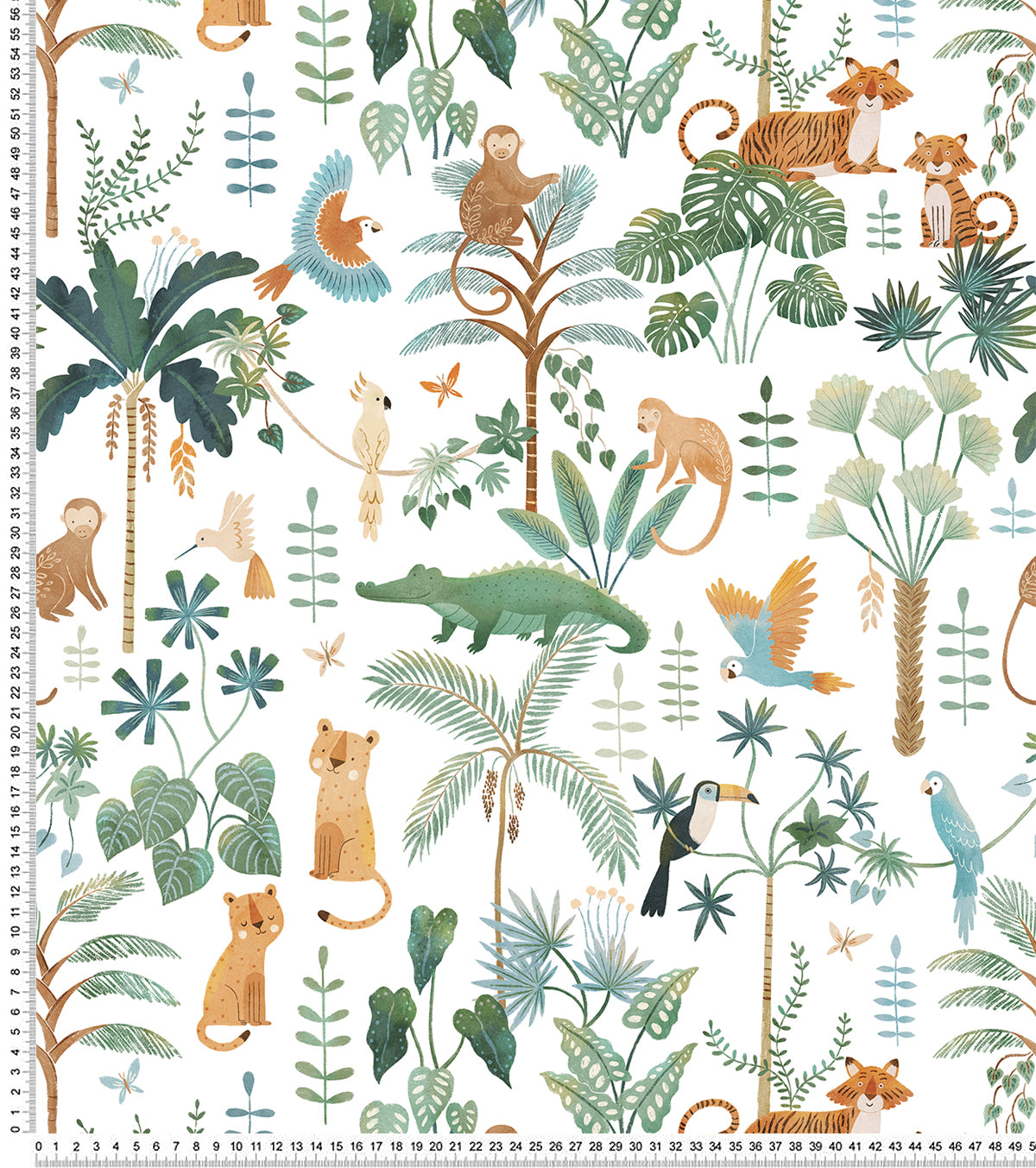 - Design ludique : Motif animalier moderne qui captive et stimule l’imagination des enfants, avec des éléments comme des singes, perroquets, et guépards dans une végétation exotique.