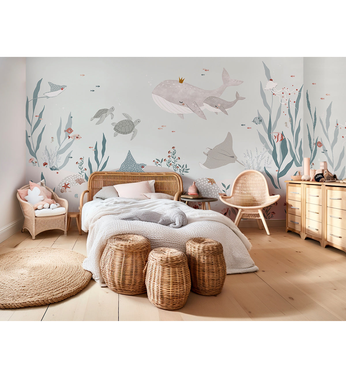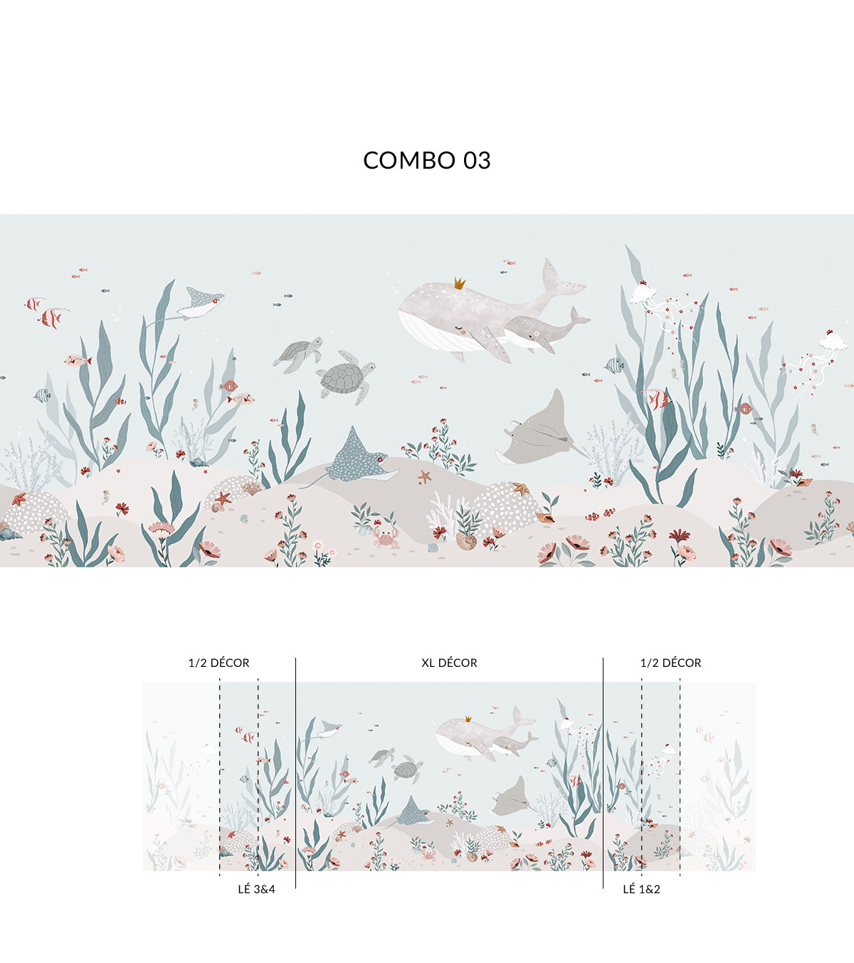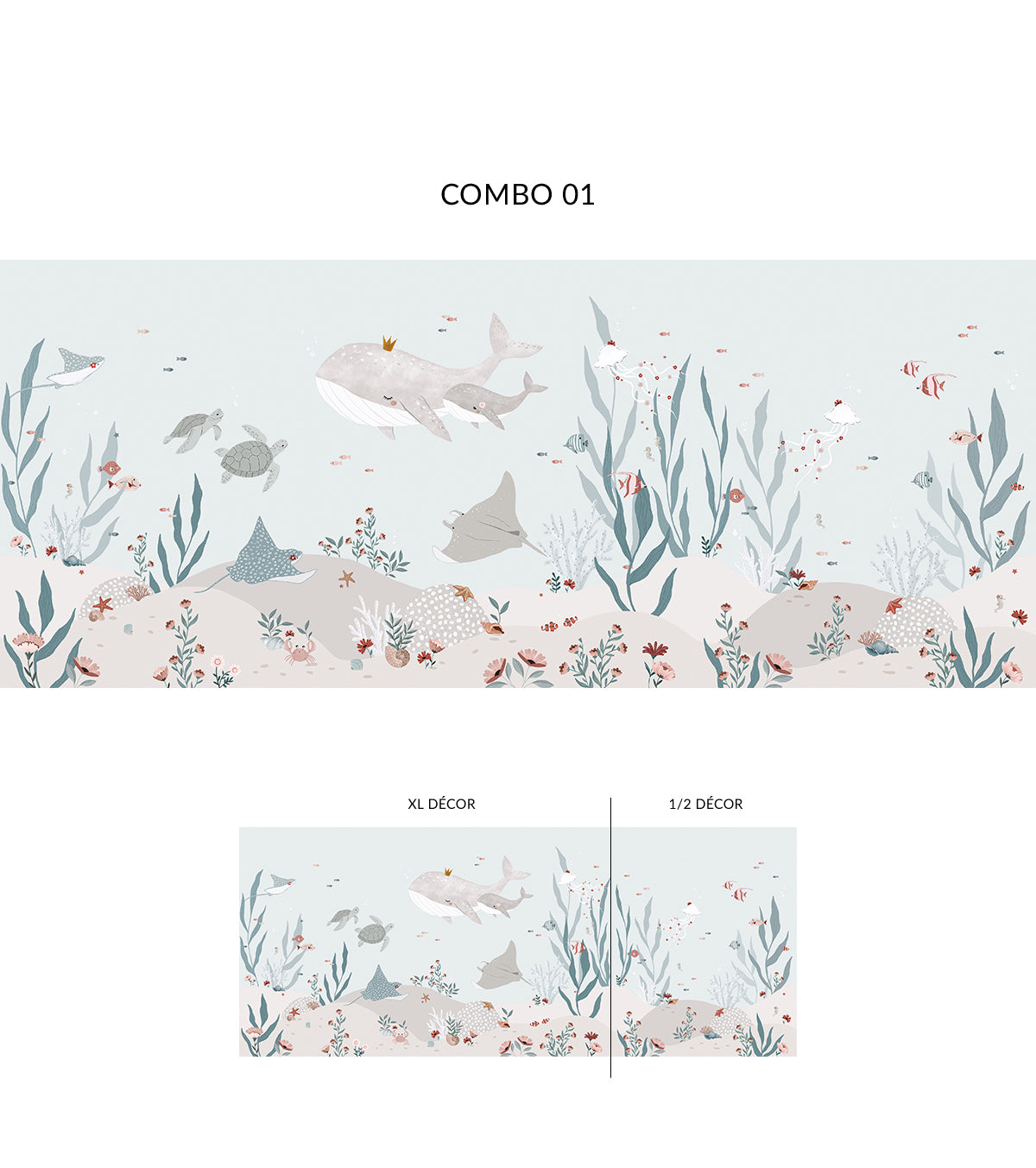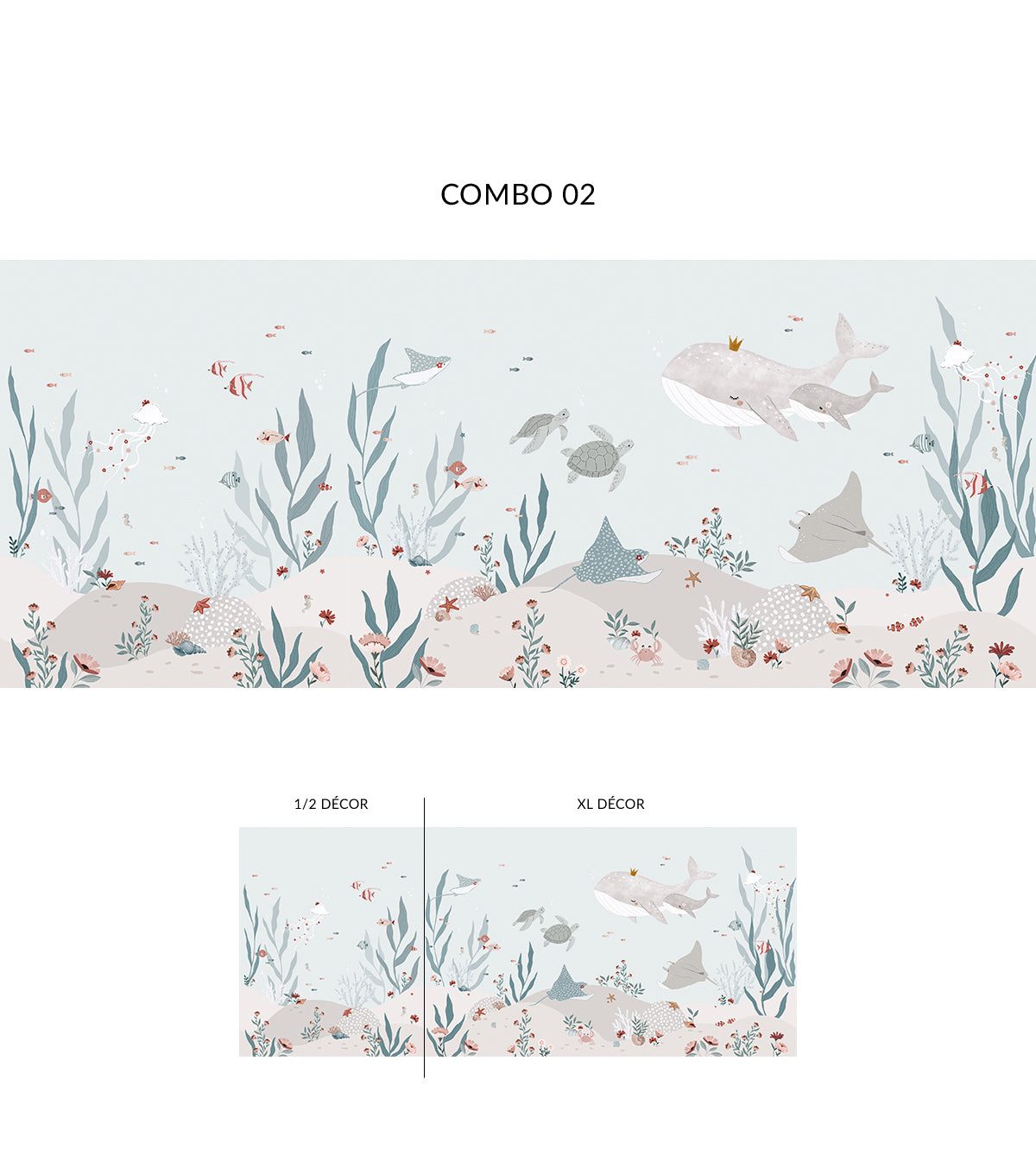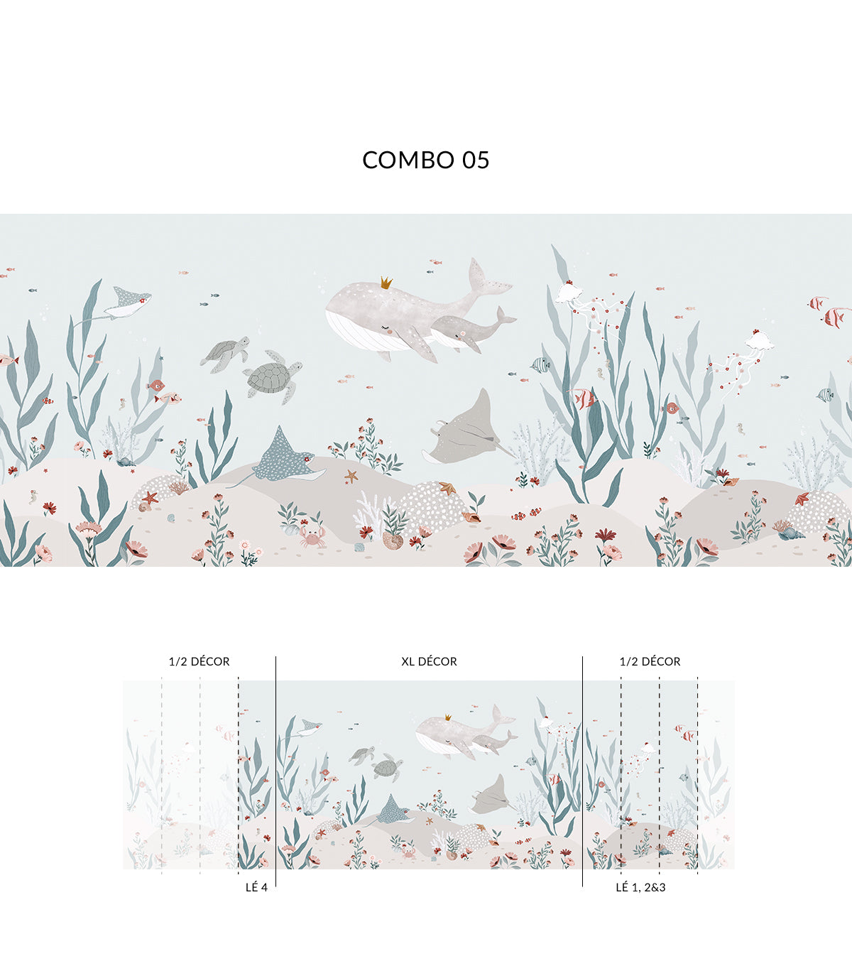 Pour compléter la décoration de la chambre de votre enfant, optez pour des accessoires comme des coussins en forme de poissons, des rideaux aux couleurs marines ou des tapis inspirés de l’océan. Ce papier peint panoramique se marie parfaitement avec des tons bleu marine, turquoise ou sable pour renforcer l’atmosphère marine.