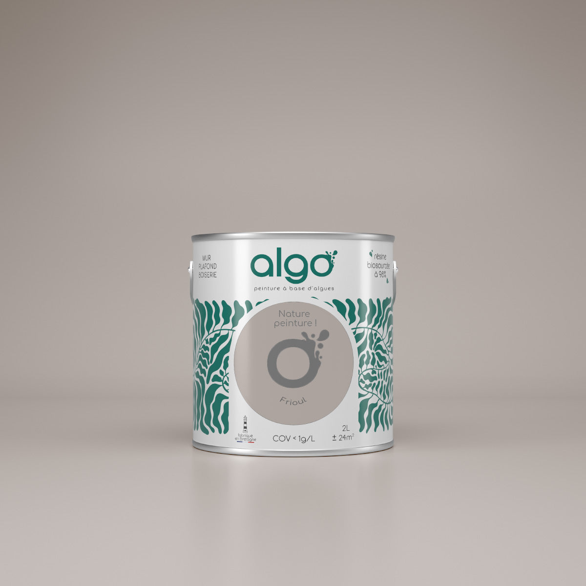 Les matières premières utilisées pour la peinture Algo sont naturelles et proviennent de sources durables. Il s'agit d'une peinture écologique à base d'algues, fabriquée 100 % française en Bretagne.