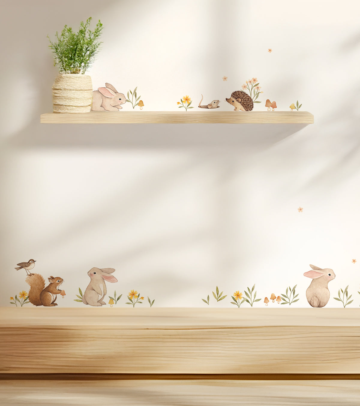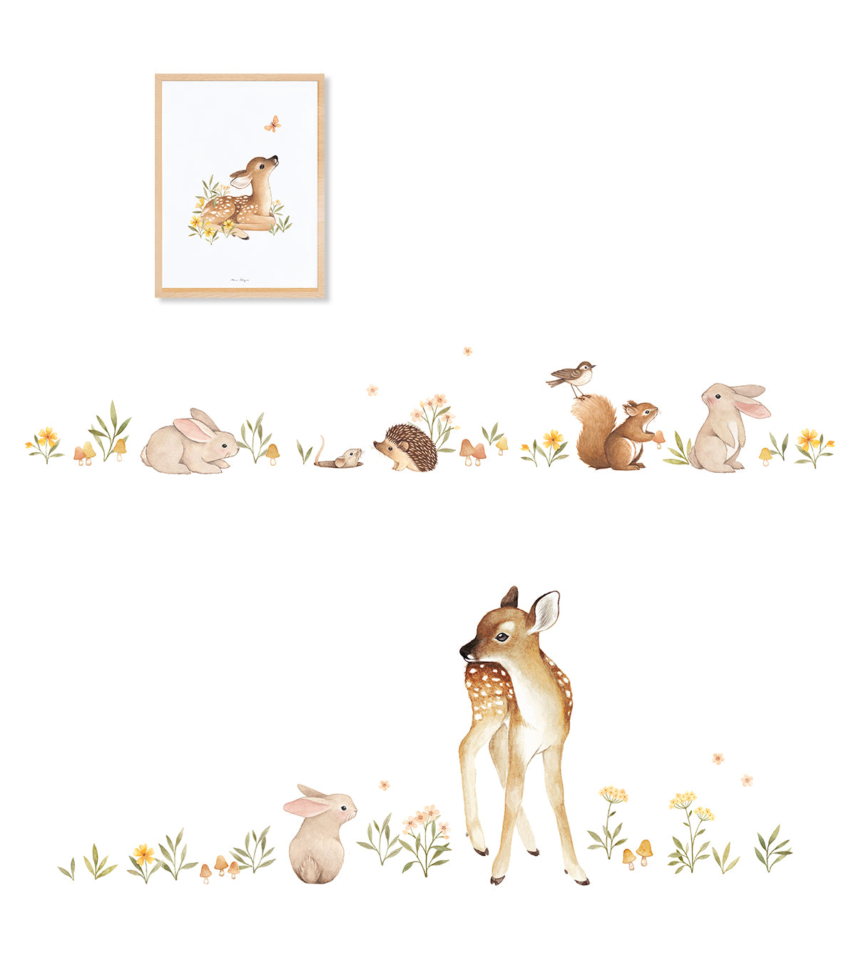 L’ensemble comprend 5 stickers assortis, soigneusement sélectionnés pour former une scène murale équilibrée et captivante. Parmi eux, retrouvez de charmants animaux de la forêt, tels qu’un cerf majestueux, un renard curieux, un hérisson espiègle et des oiseaux délicats, entourés d’éléments végétaux pour une immersion totale.