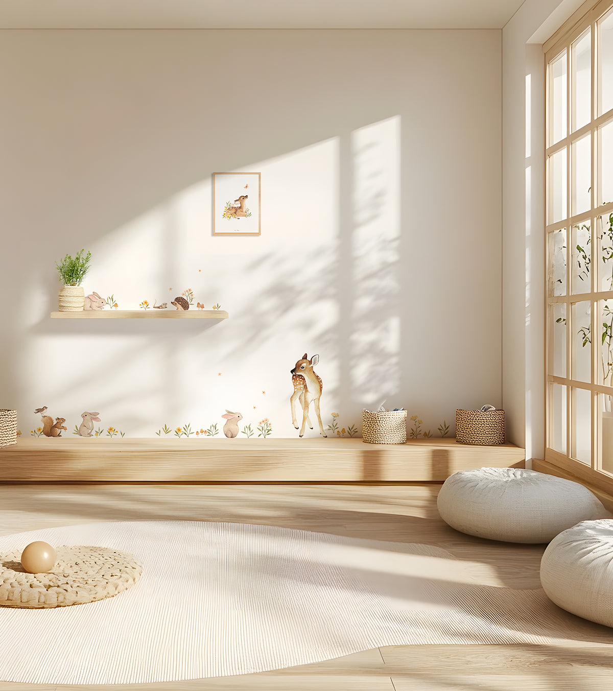 Pour une décoration réussie, associez ces stickers muraux forêt et animaux avec des éléments aux couleurs douces :
