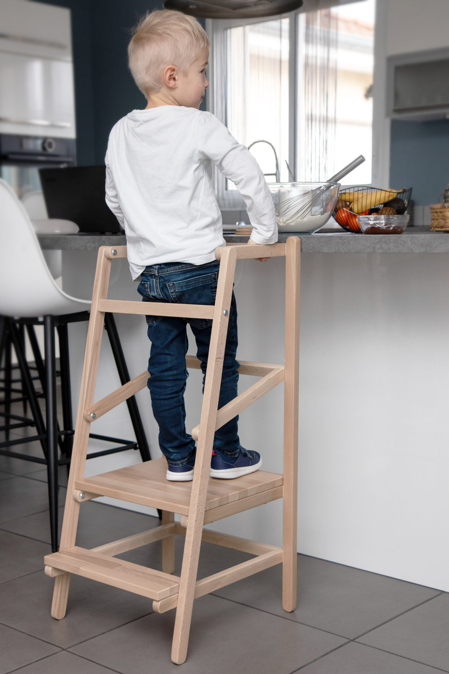 La Tour d'observation/apprentissage enfant en bois hêtre brut est conçue pour offrir aux jeunes enfants un espace sécurisé pour explorer et apprendre. Fabriquée en bois massif, elle est adaptée aux enfants âgés de 8 mois à 60 mois. Avec son design en rectangle et sa construction robuste, cette tour favorise l'autonomie des enfants en leur permettant d'atteindre des surfaces plus élevées, tout en garantissant leur sécurité.